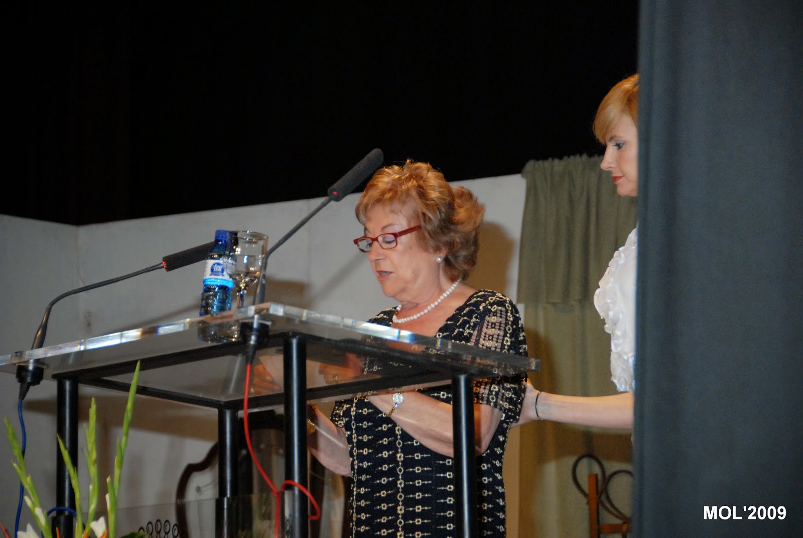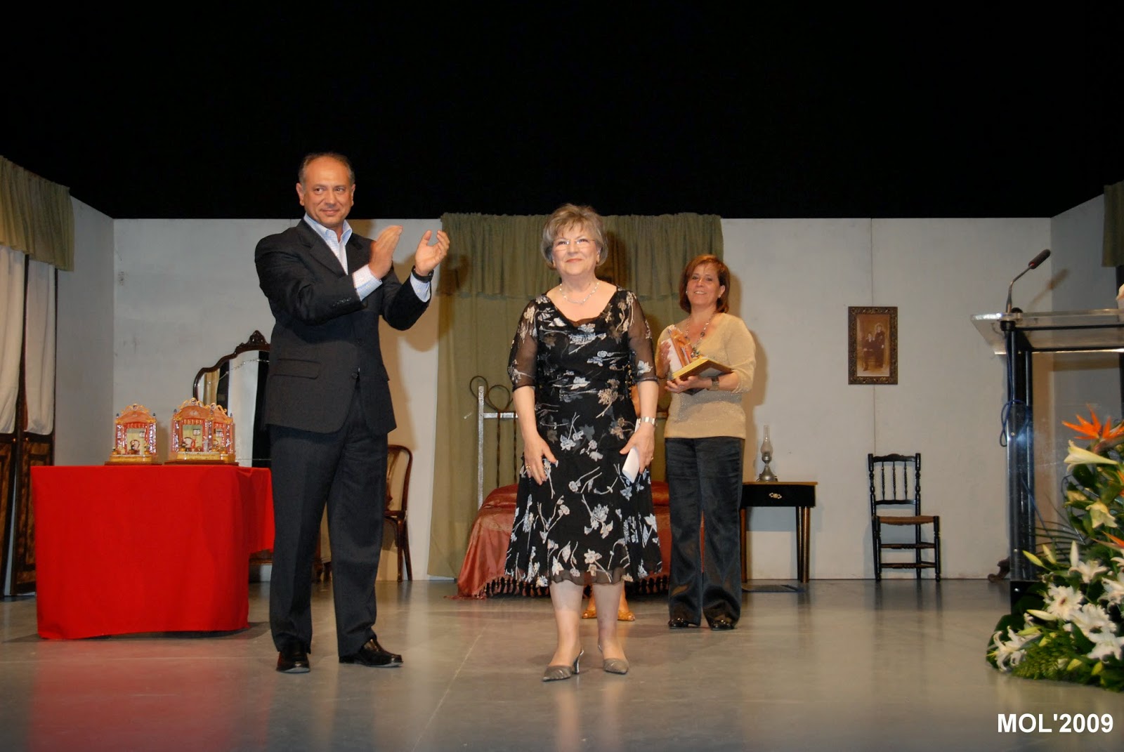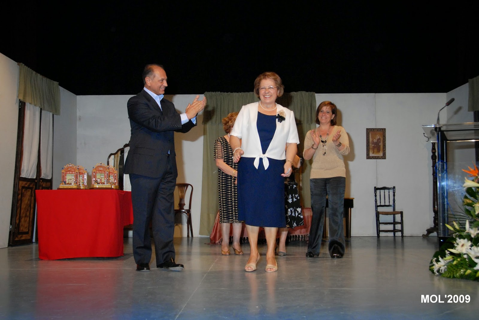 En l’Auditori Germanies, en l’escenari ya preparat per a la representacio teatral que es va oferir al final de l’acte, s’encontrava a l’esquerra les 4 peces de ceramica que representen un escenari de teatre. Presenta l’acte la senyoreta Esmeralda Ballesteros.