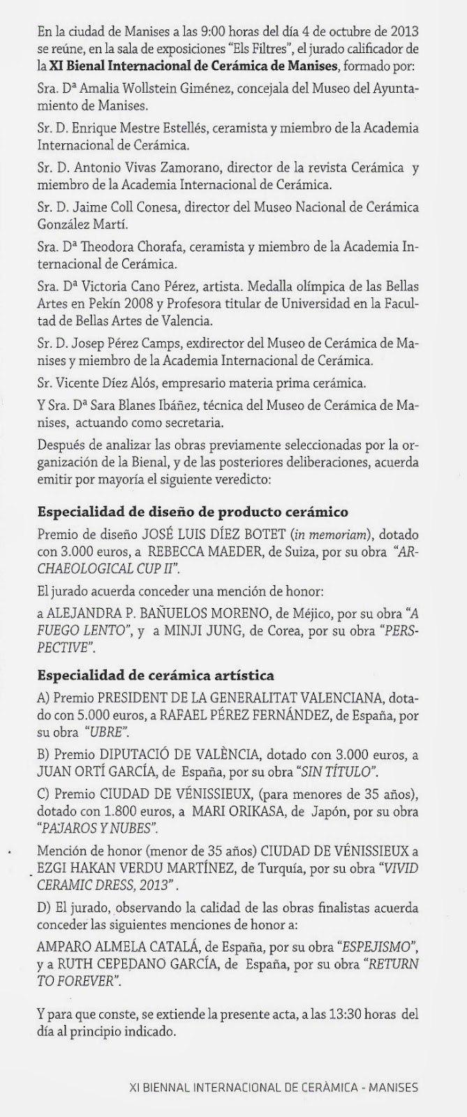 Los maniseros debemos ser los primeros en apreciar y valorar la repercusión que a nivel nacional e internacional tiene esta Bienal para la cerámica, para nuestra Ciudad, Manises, aunque sea por este tipo de acontecimientos que de cada dos años tiene lugar, y -como amantes de la cerámica- debemos visitar y reconocer el ingenio y las nuevas tendencias que en cerámica se están fabricando. Visitemos las exposiciones, que seguro que encontraremos nuevos matices hasta hora desconocidos.