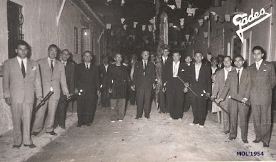 Procesión de San Antonio en Septiembre de 1954. De izquierda a derecha: xxx, xxx, xxx, Salvador Sanchis, xxx, José María Sanchis, Vicente Gabriel (El manyà), Juan Ruiz Alemany (Chuano el Carboner), xxx, Manolo Tarrasa, xxx. Foto de Gadea. Archivo de Trini Royo Sanchis.