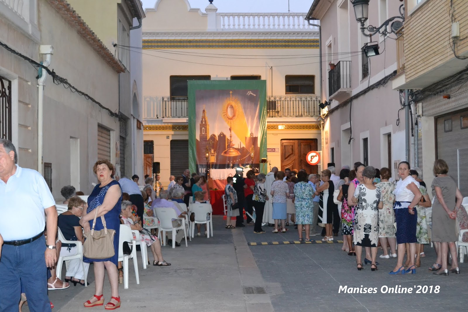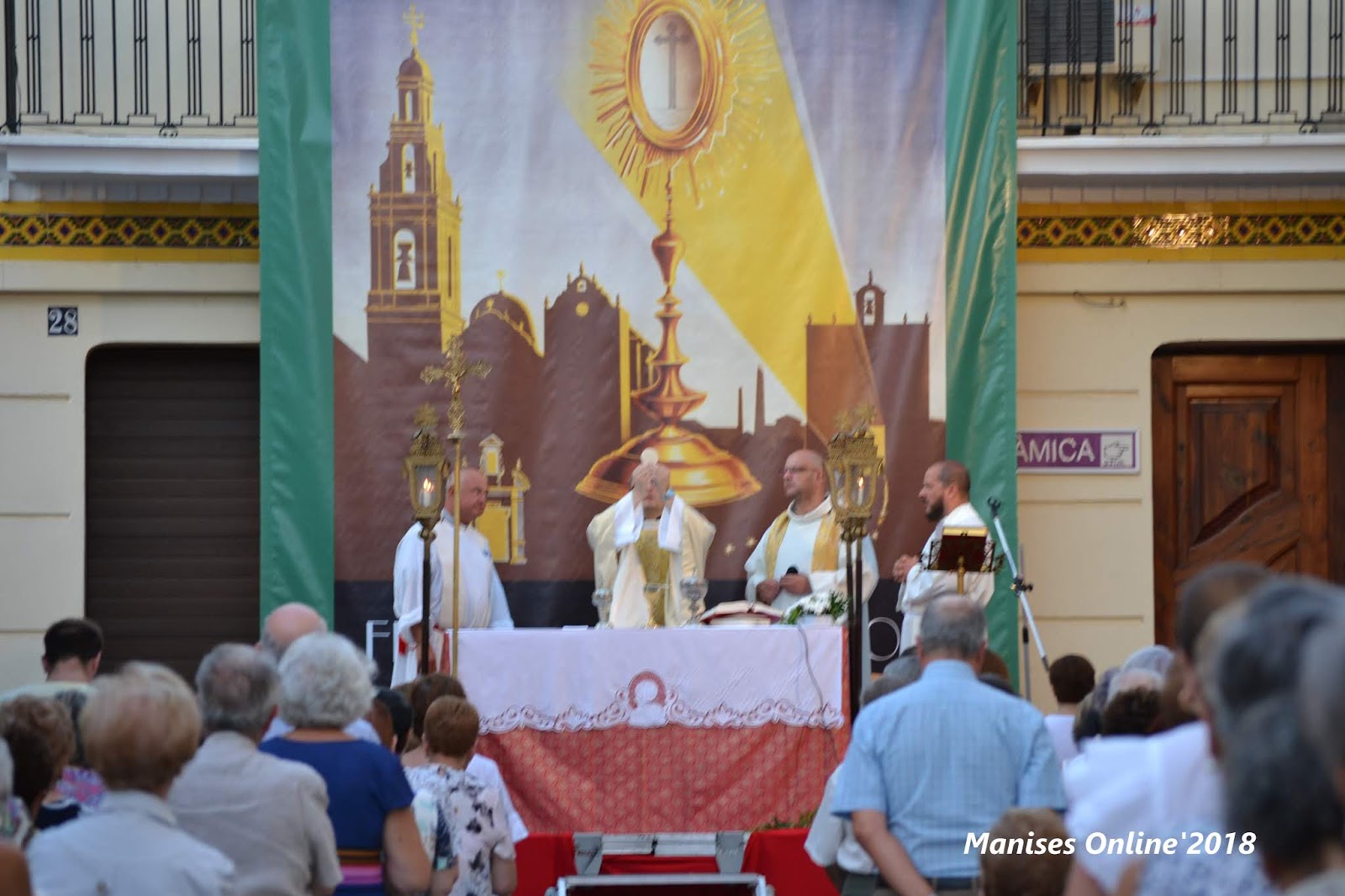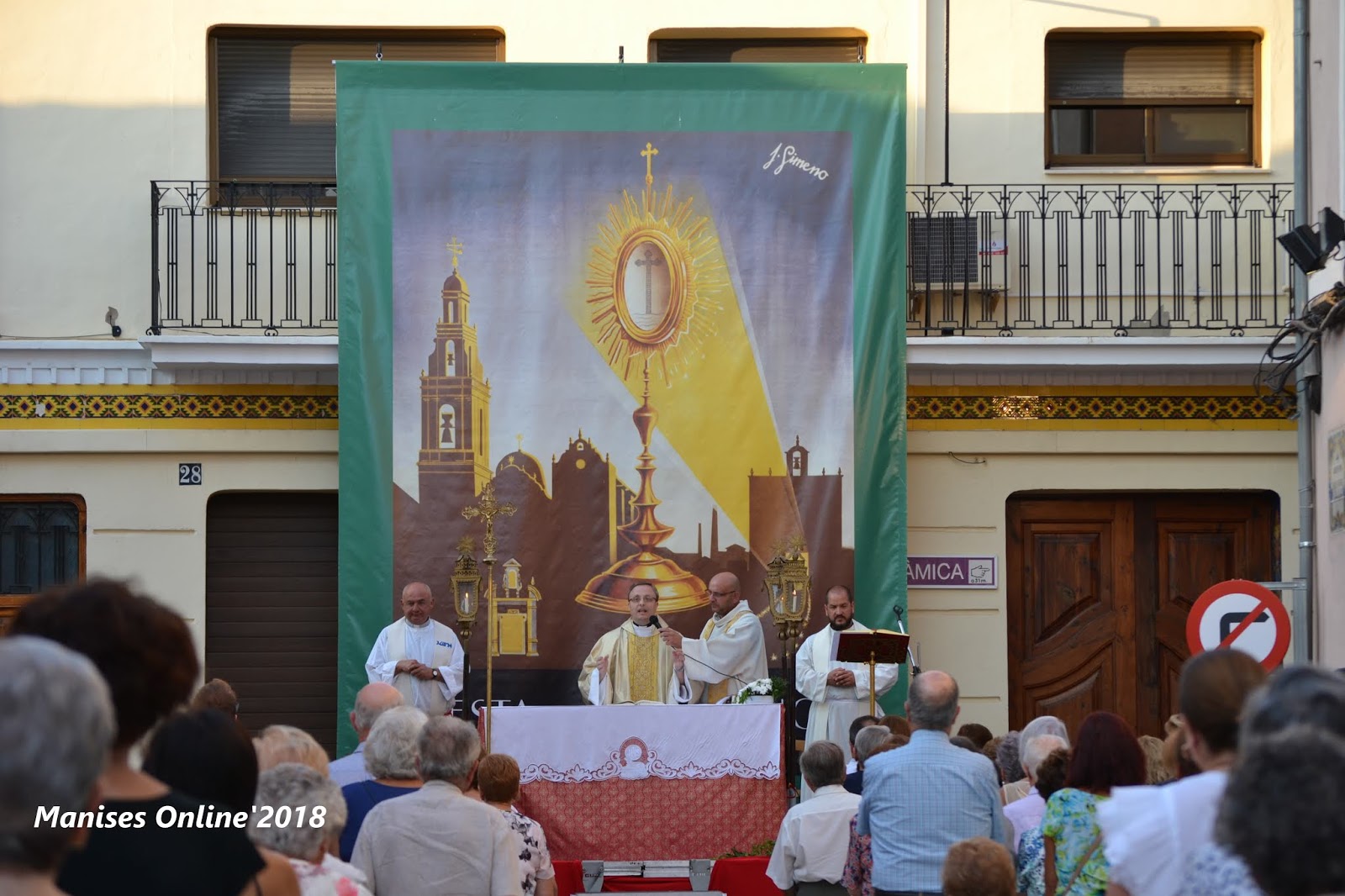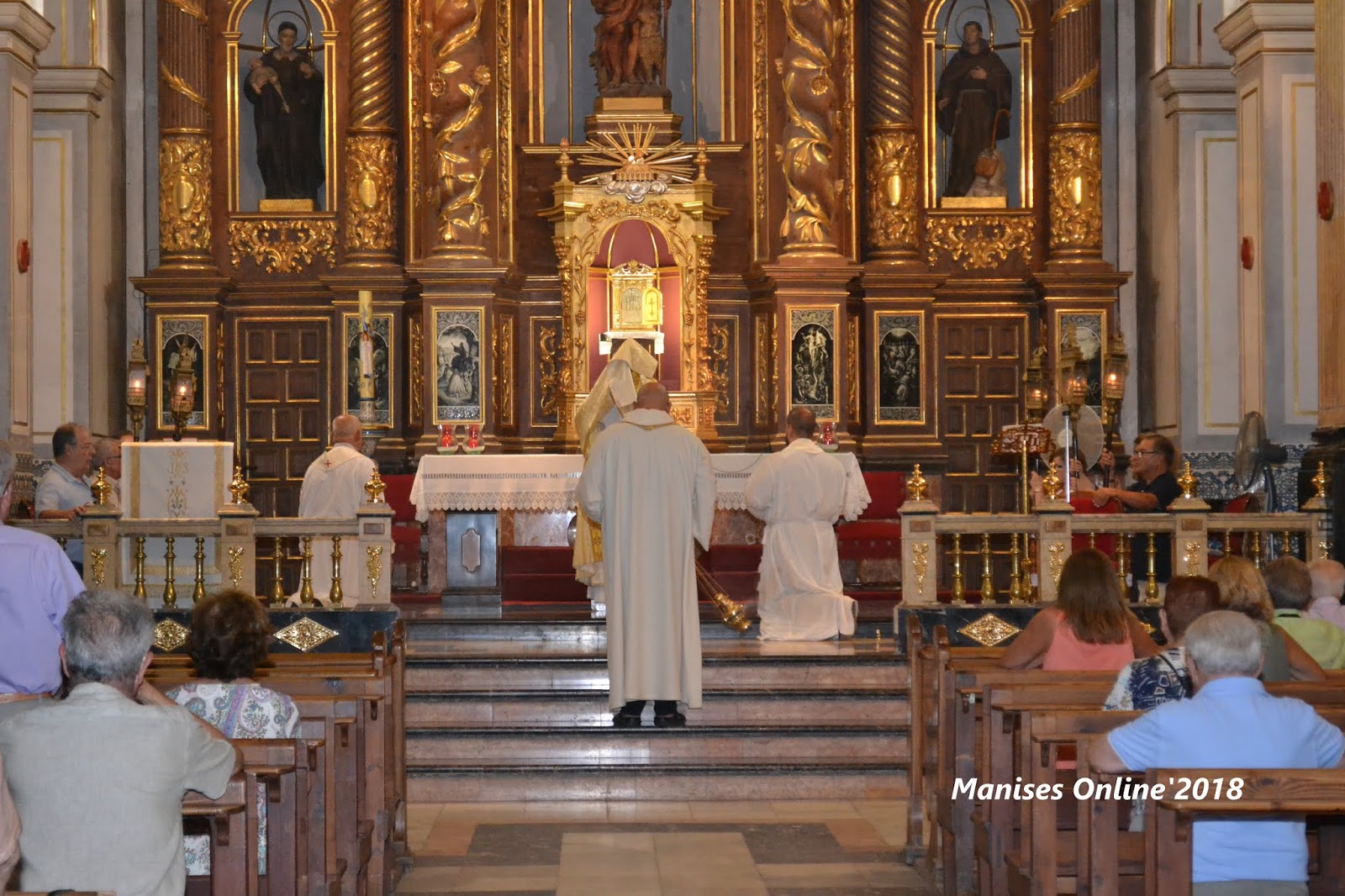 Teniendo como fondo el tapiz pintado por nuestro Manisero Ilustre José Gimeno Martínez, y el altar preparado para la celebración de la Santa Misa, el 14 de Agosto conmemoramos el traslado del templo viejo al nuevo un 14 de agosto de 1751.