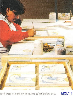 Rafael Guerrero con dos de sus colaboradores, empezando a pintar uno de los muchísimos azulejos que compondrán la restauración.