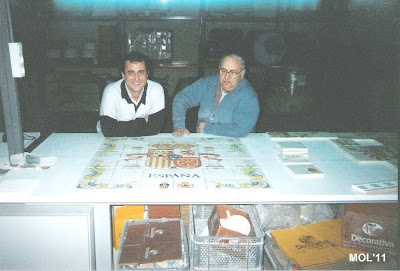 Rafael con otro colaborador en la importante tarea de restauración. En esta foto se puede ver el mural de España, con la cenefa y sin el marco azul.