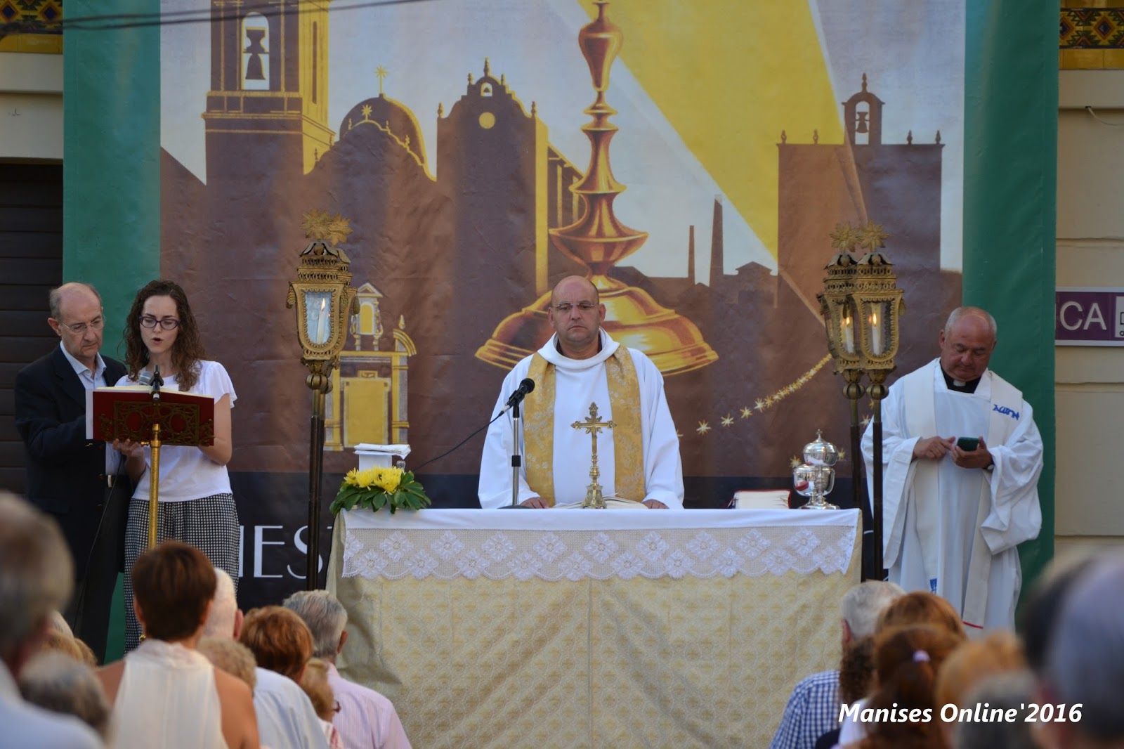 Por la mañana se prepararon todos los elementos necesarios para que pudiera celebrase el acto: Altar, flores, megafonía, sillas para poder sentarse, etc., todo ello teniendo como vista principal el tapiz pintado por el gran ceramista manisero José Gimeno Martínez.