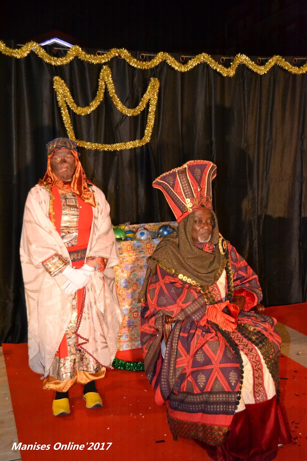 Estos eran los tronos que los Reyes han ocupado. Detrás de ellos se puede ver las enormes cajas con regalos que se iban a entregar a todos los niños que habían escrito su carta solicitándolos.