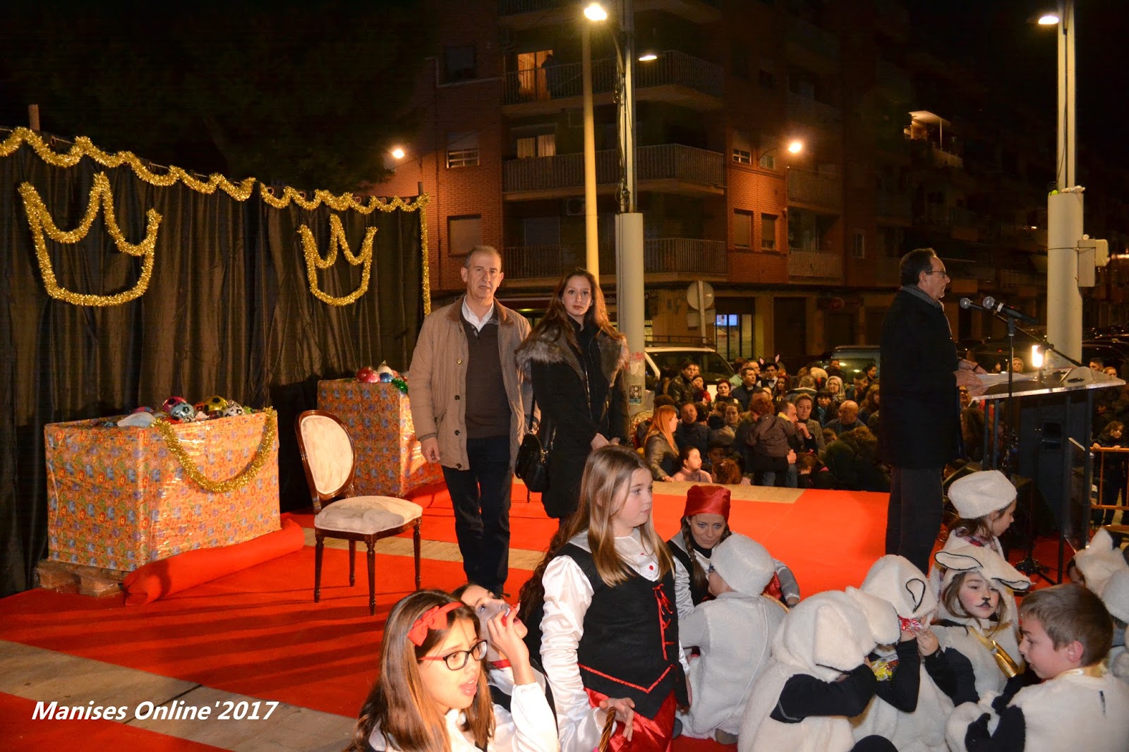 Por los micrófonos se iba anunciando la llegada de las diversas asociaciones que estaban participando en la cabalgata, y encima del escenario el Alcalde de Manises, con la Concejala de Fiestas, les esperaban para poderles saludar y darles una cordial bienvenida.