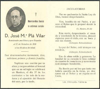 Al producirse la Guerra Civil en julio de 1936 don José María Plá continuó viviendo en su domicilio, en la calle de la Pelota o de Juan Bautista Valldecabres, número 12-1º, hoy calle del Dr. Catalá Díez. Y allí permaneció hasta el día 26 de septiembre fecha en que fue conducido al cuartel de las Milicias, situado en el entonces convento de las carmelitas descalzas, hoy día casa de Cultura. Allí durante un mes sufrió un prolongado martirio, al estar sometido al sufrimiento y a toda clase de vejaciones.