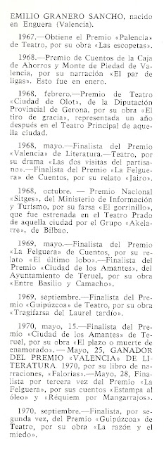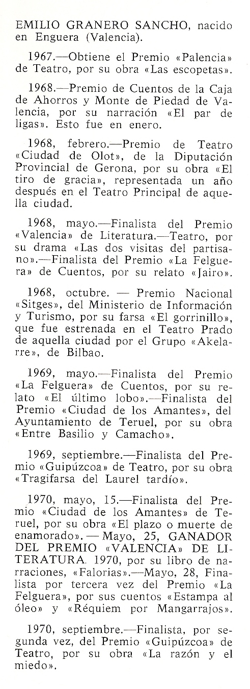 1968 obtuvo el Premio de Cuentos Ciudad de Gandía. Este mismo año