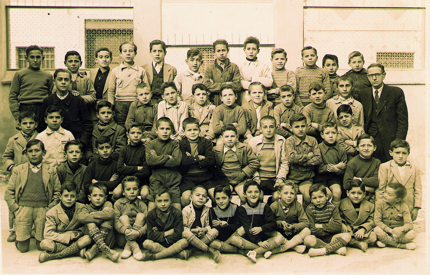 El maestro Don Vicente Nicolau Balaguer junto a un grupo de alumnos en el año 1945, en las escuelas del Patronato de Acción Social. En esta fotografía puedo apreciar a -además del maestro-: