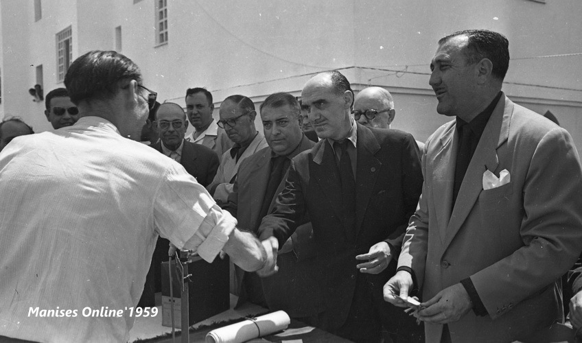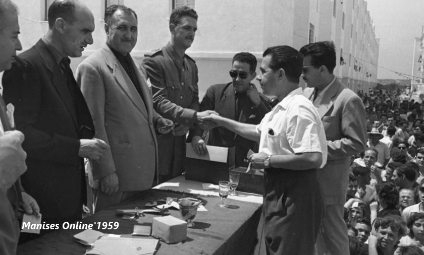 A l’Alcalde de Manises l’acompanyaven el Retor de la Parroquia de Sant Joan Batiste Don José Granell Cardo, el Retor de la nova (des del 21.11.1957) Parroquia de l’Immaculat Cor de Maria Don Joaquín Montes Mollá, atres carrecs civils manisers i José María Marticorena Ruiz corresponsal del periodic LEVANTE en la Nostra Ciutat. Tambe estava rebent-los la Regina de les Festes de Manises, la senyoreta Carmen Luisa Barberà Nolla, la Cort d’Honor i els Clavaris de les festes.