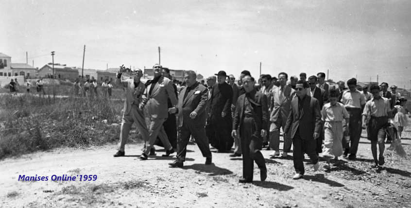 Al Alcalde de Manises le acompañaba el Cura de la Parroquia de San Juan Bautista Don José Granell Cardo, el Cura de la nueva (desde el 21.11.1957) Parroquia del Inmaculado Corazón de María Don Joaquín Montes Mollá, otros cargos civiles maniseros y José María Marticorena Ruiz corresponsal del periódico LEVANTE en Nuestra Ciudad. También estaba recibiéndolo la Reina de las Fiestas de Manises, la señorita Carmen Luisa Barberà Nolla, la Corte de Honor y los Clavarios de les fiestas.