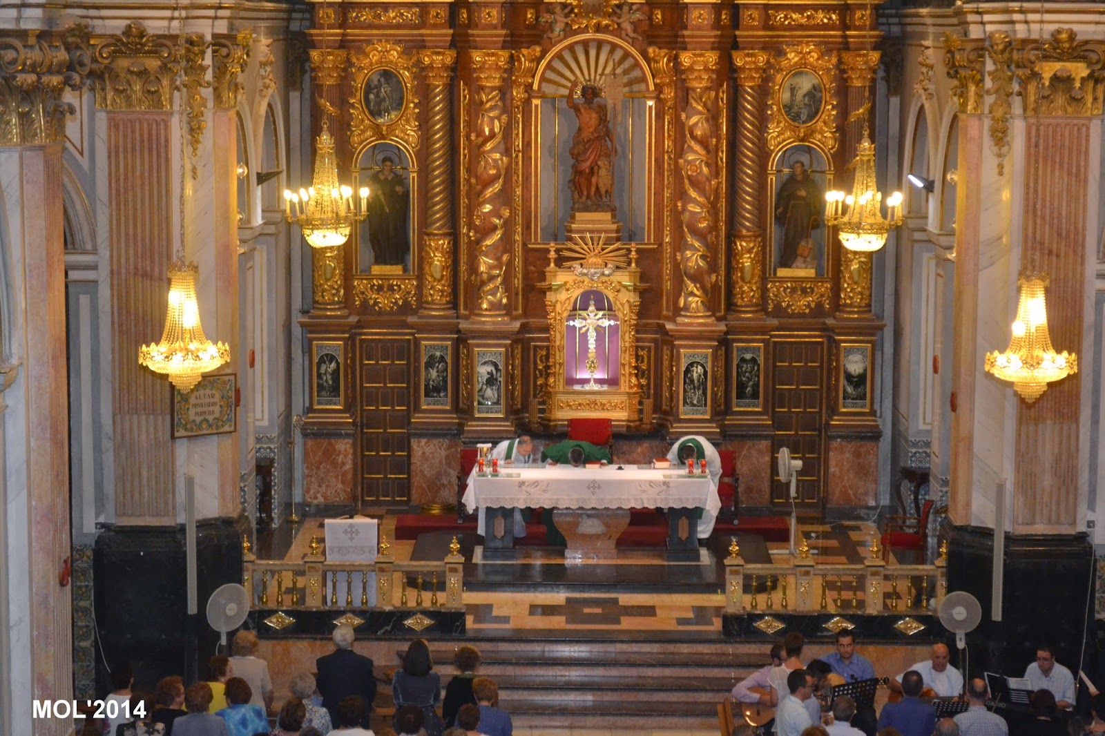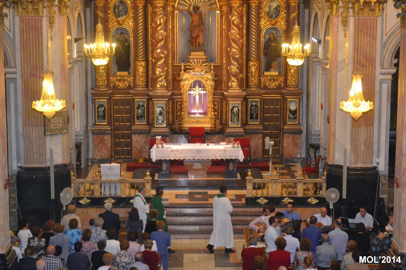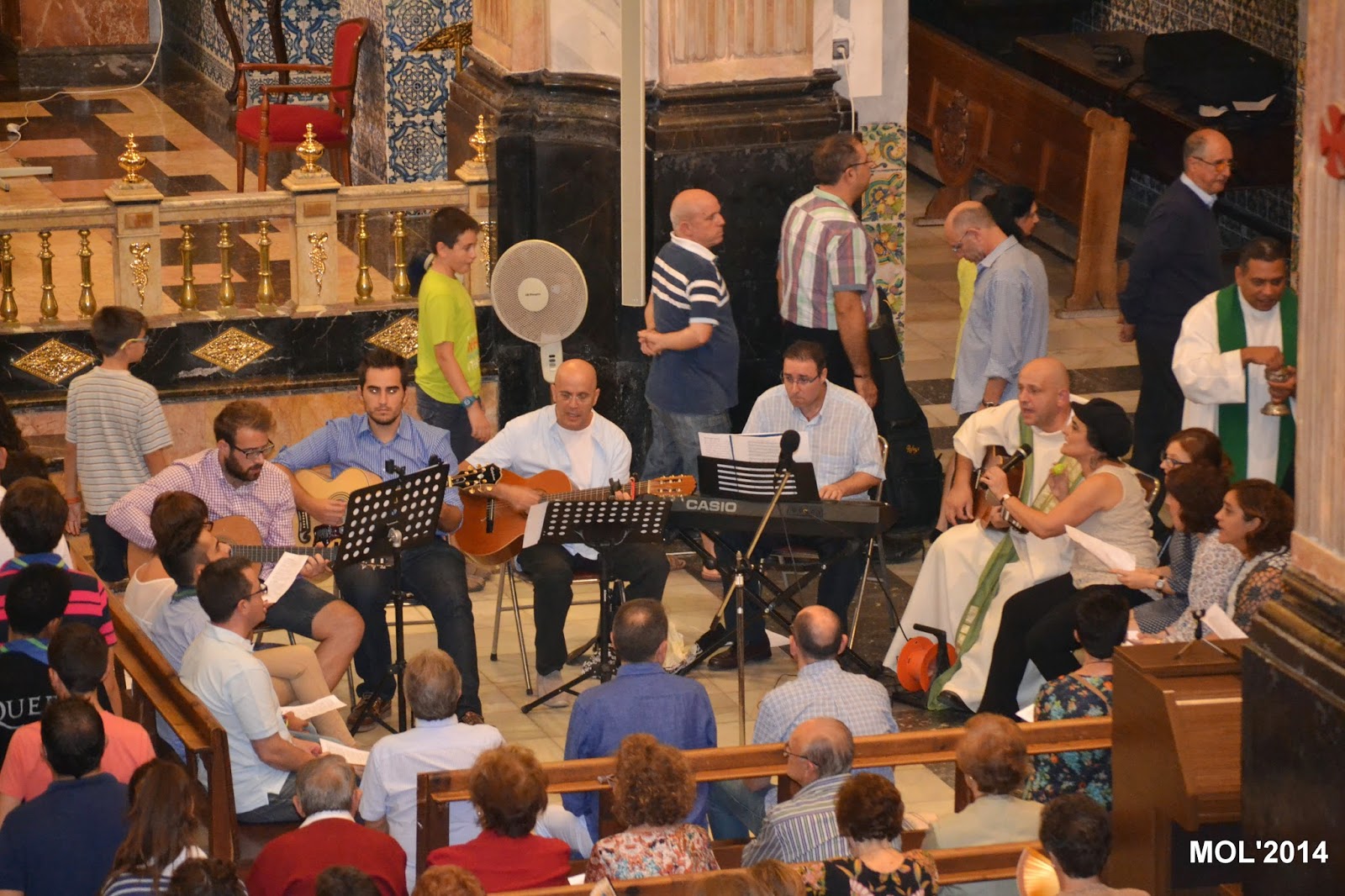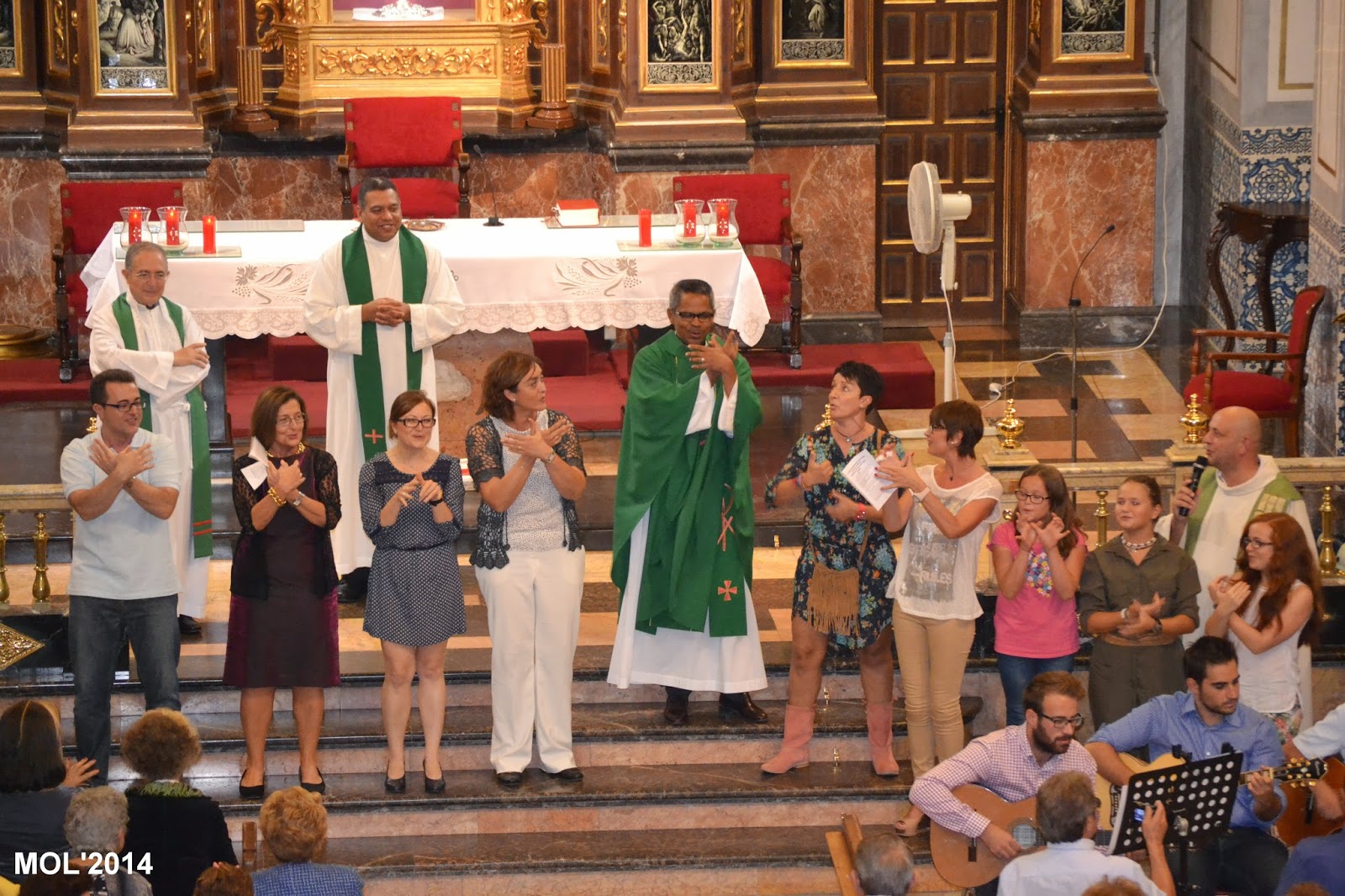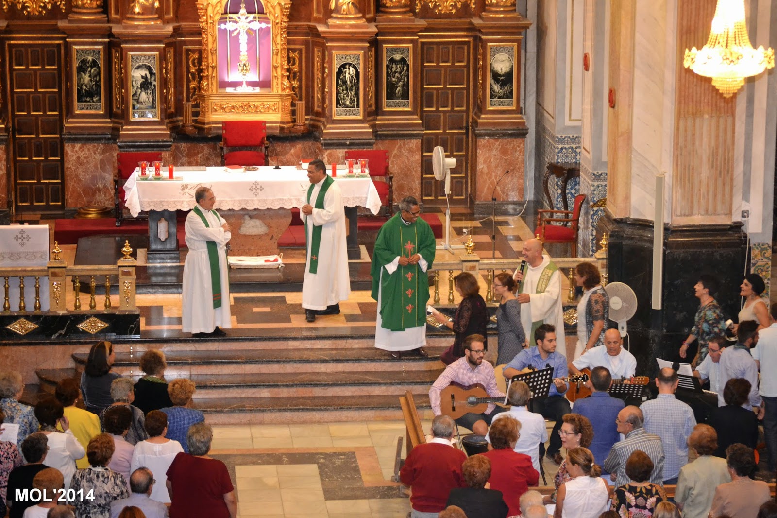 Acompañado por Don Valentín Peñarrocha Carbonell, anterior Párroco hasta el mes de Septiembre de 2013 y ahora Párroco en Marines, y por el nuevo sacerdote, de nacionalidad venezolana, que viene a hacer las mismas funciones de apoyo que Don Juan, dio comienzo la Santa Misa, con la Iglesia llena de feligreses que querían despedirse del que durante estos meses ha estado entre nosotros. La celebración ha estado acompañada por el grupo de jóvenes de la parroquia con guitarras y cantos de despedida, a los que se les había unido el actual Párroco Don Pablo Tos Real.