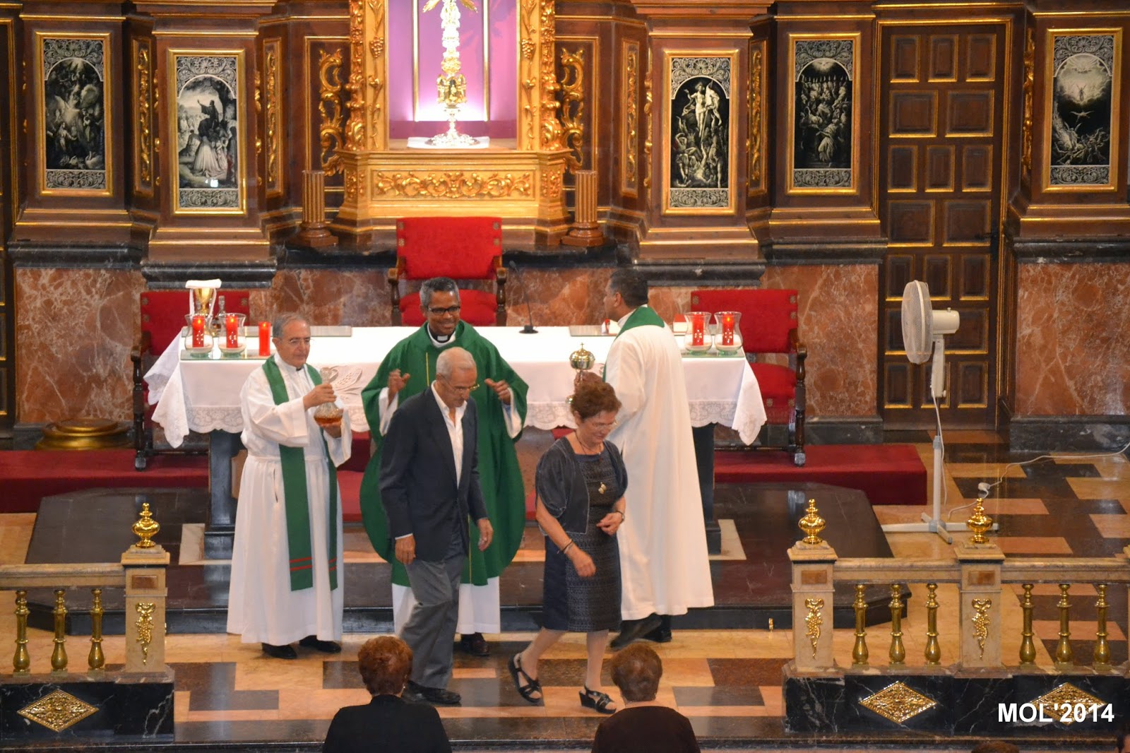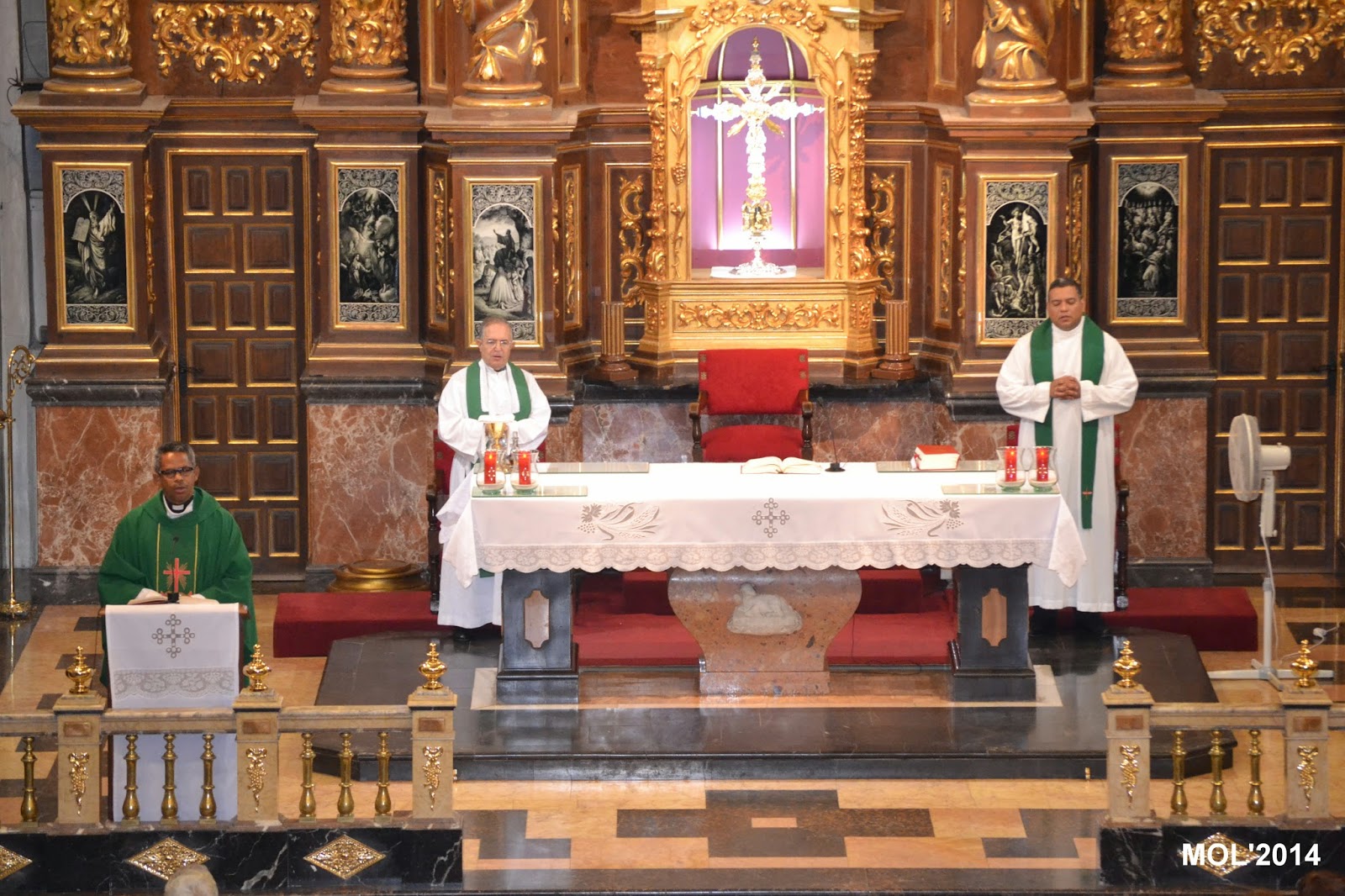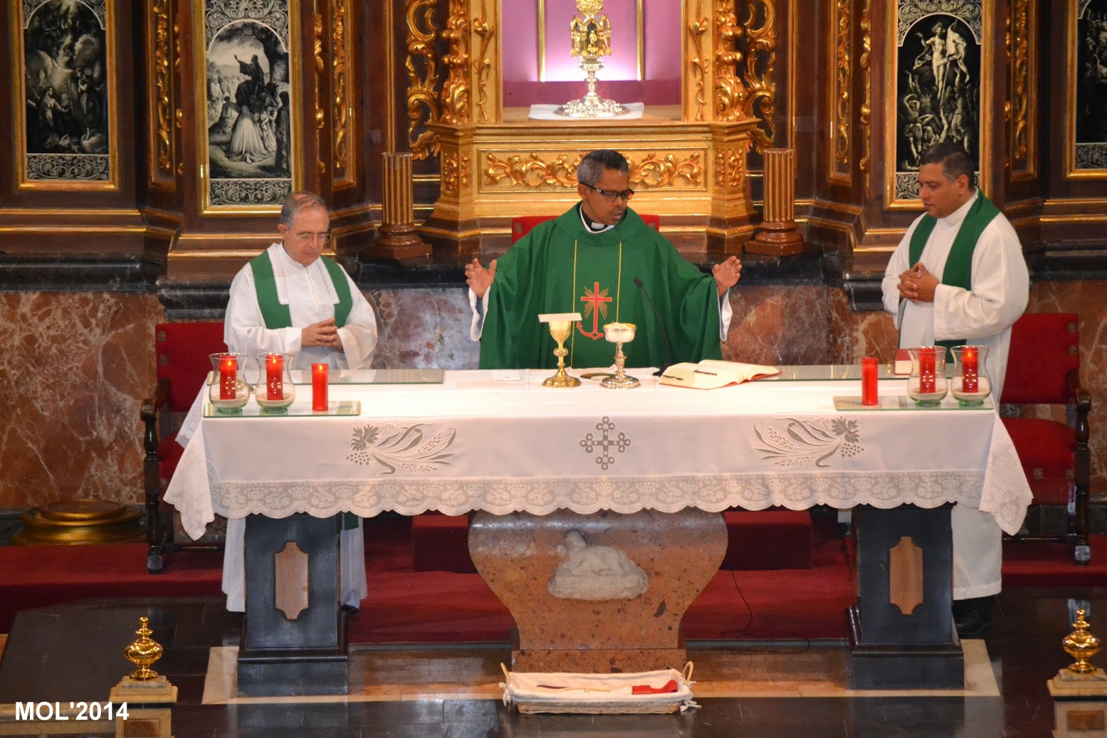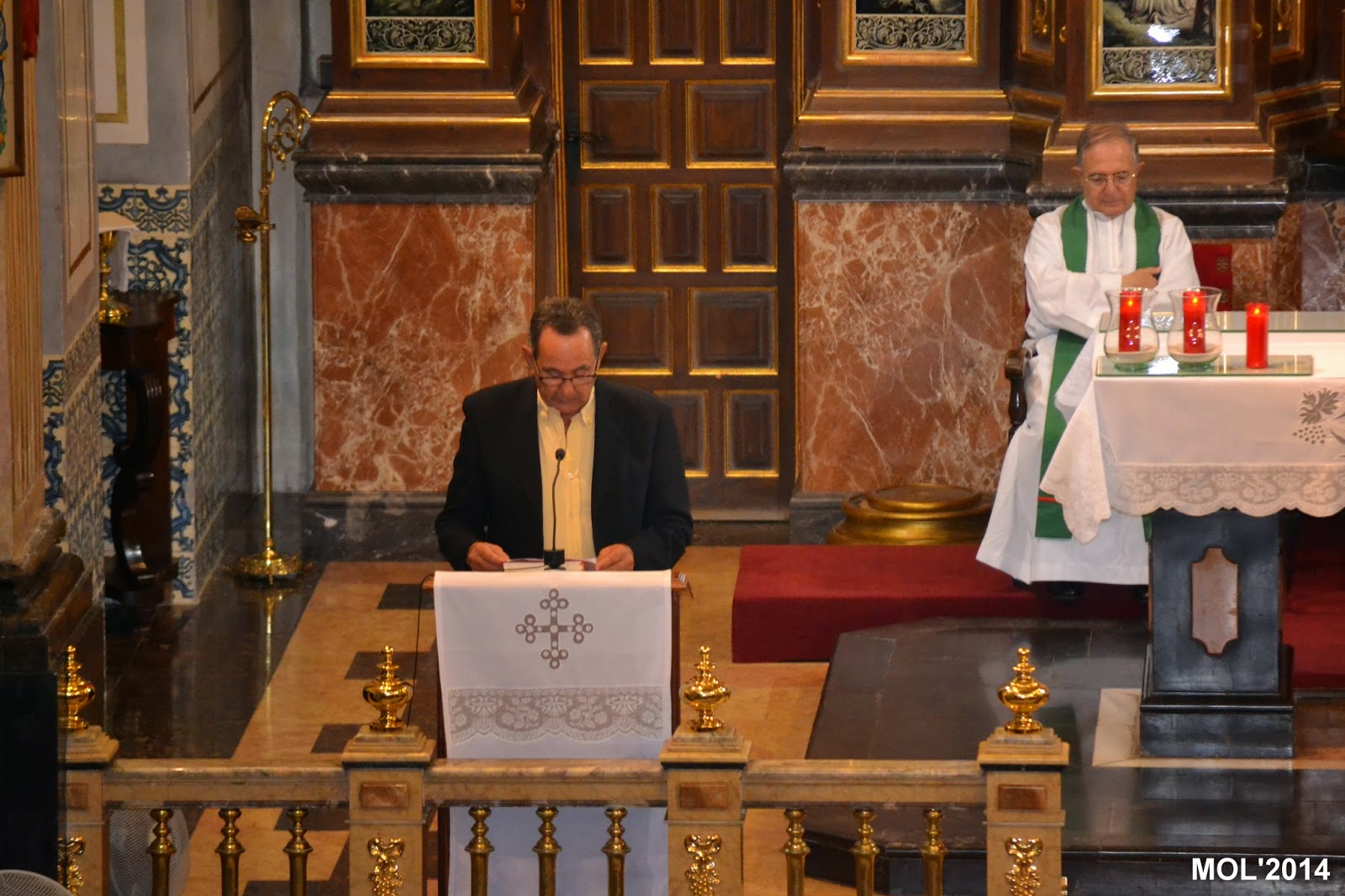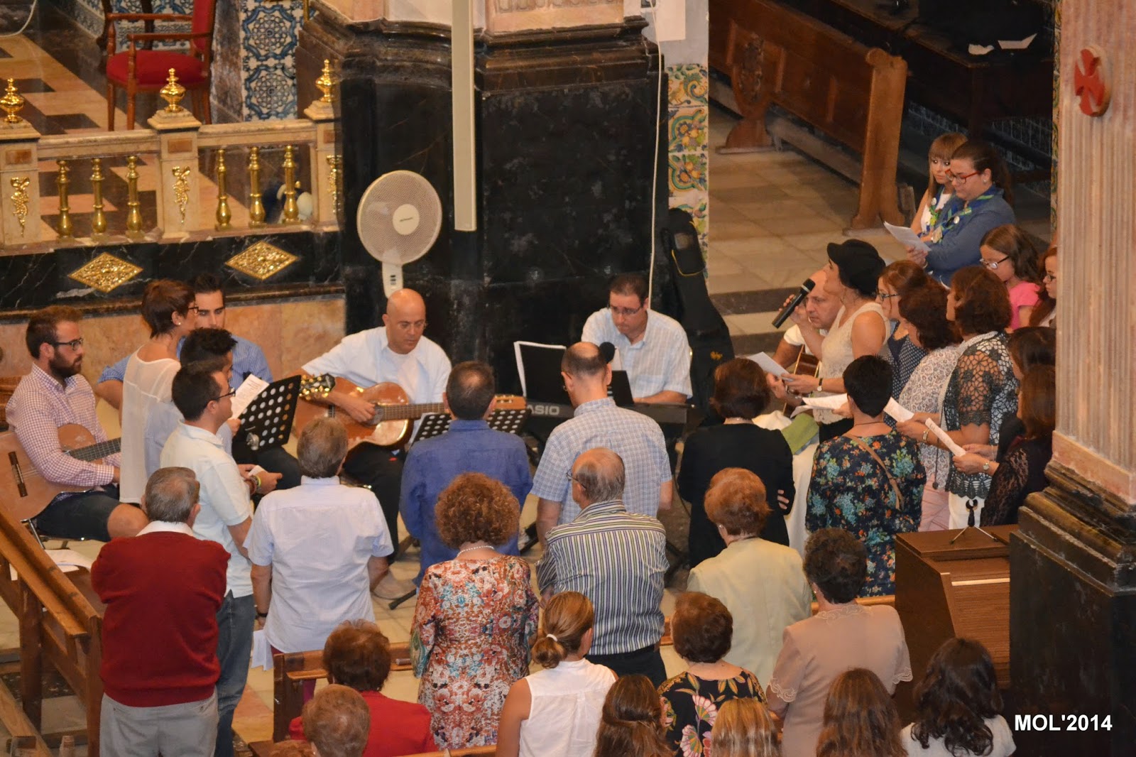 Acompañado por Don Valentín Peñarrocha Carbonell, anterior Párroco hasta el mes de Septiembre de 2013 y ahora Párroco en Marines, y por el nuevo sacerdote, de nacionalidad venezolana, que viene a hacer las mismas funciones de apoyo que Don Juan, dio comienzo la Santa Misa, con la Iglesia llena de feligreses que querían despedirse del que durante estos meses ha estado entre nosotros. La celebración ha estado acompañada por el grupo de jóvenes de la parroquia con guitarras y cantos de despedida, a los que se les había unido el actual Párroco Don Pablo Tos Real.