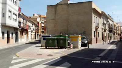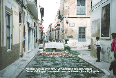 Esta fotografía es de 1972, la calle del Sagrario, y a la derecha se puede ver el cuadro de azulejos, vertical, que al ampliarlo parece que sea un árbol de pie. Cuando se remodeló la Capelleta se debió guardar, ya que -como pueden observar- en la otra fachada de la calle del Sagrario, pasando la calle de Mossen Pere Esplugues, ya se ve que estaba el cuadro, también vertical, que en la actualidad (estoy hablando del 15.01.2021) todavía está.