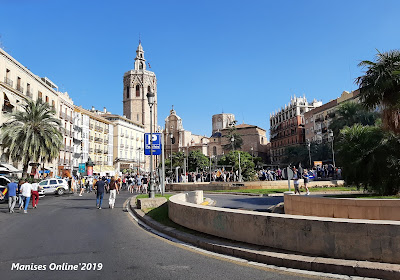 Plaça de la Reina, a on es veu -a la dreta- la provessó en la Real Senyera que venia de Lo Rat Penat i anava a la Catedral al solemne Te Deum.