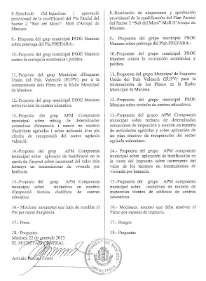 En el se detallan las informaciones que se van a dar cuenta a los partidos de la oposición: PSOE, EU y APM, así como las mociones de estos últimos sobre temas de relevancia e interés para la Ciudad.