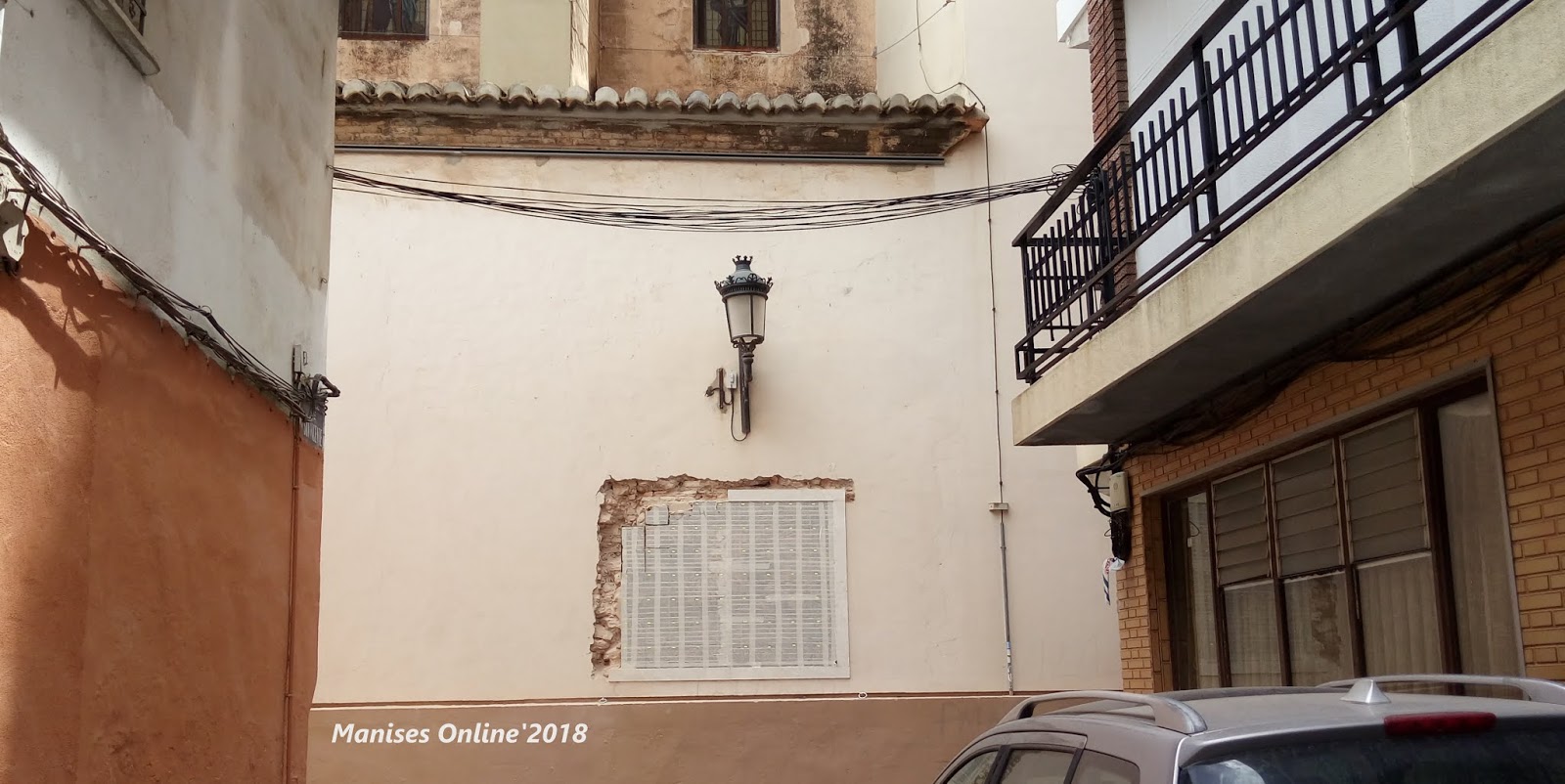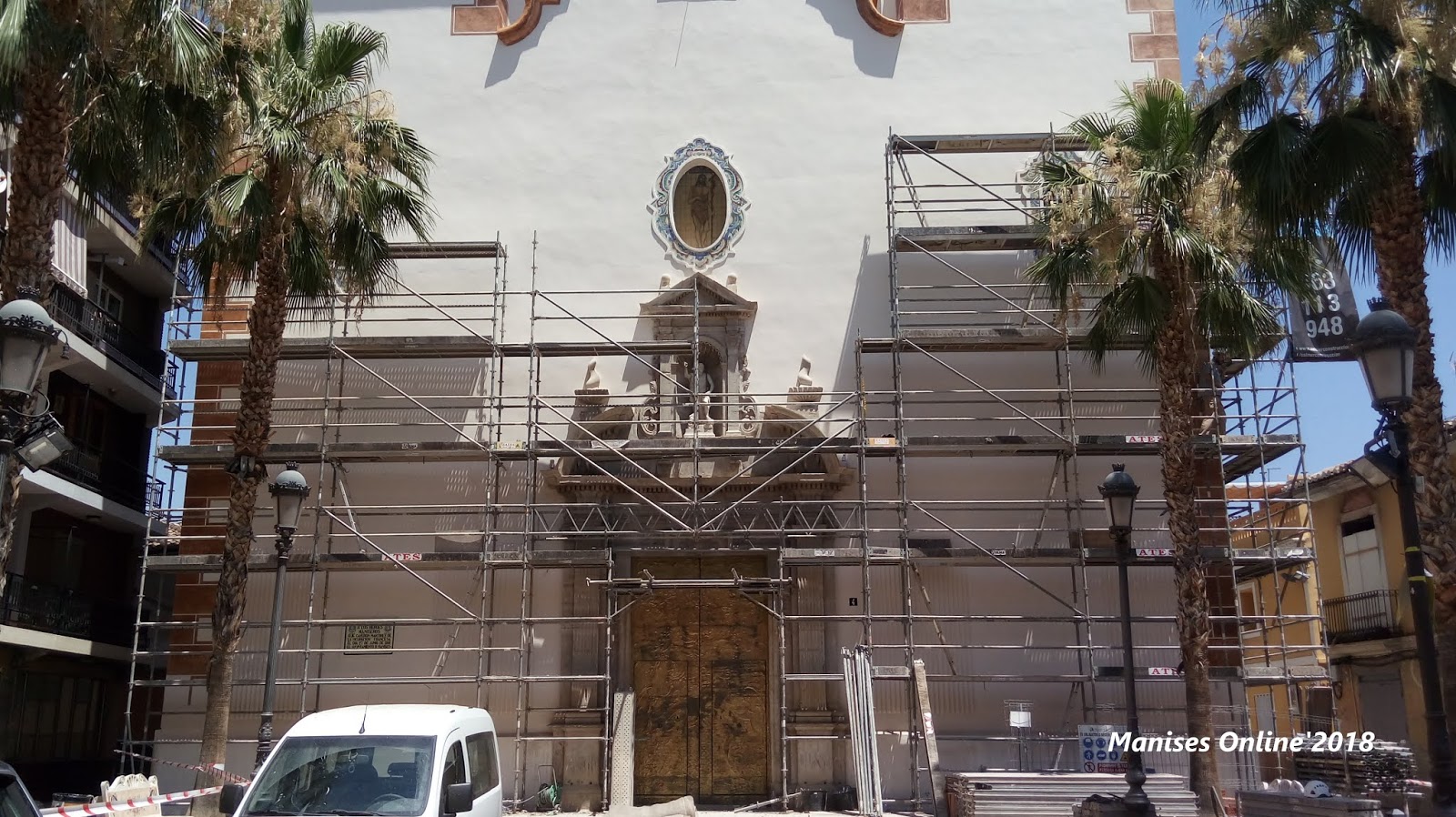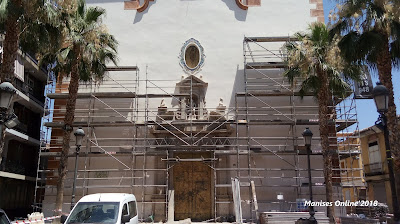Este era el aspecto que tenía la fachada de la Iglesia de San Juan Bautista de Manises en el mes de Marzo de 2018, en que han dado comienzo las obras de restauración del templo, ya que existen múltiples zonas para restaurar, tanto en la fachada como en la parte superior, (tanto en la fachada como de las tejado).