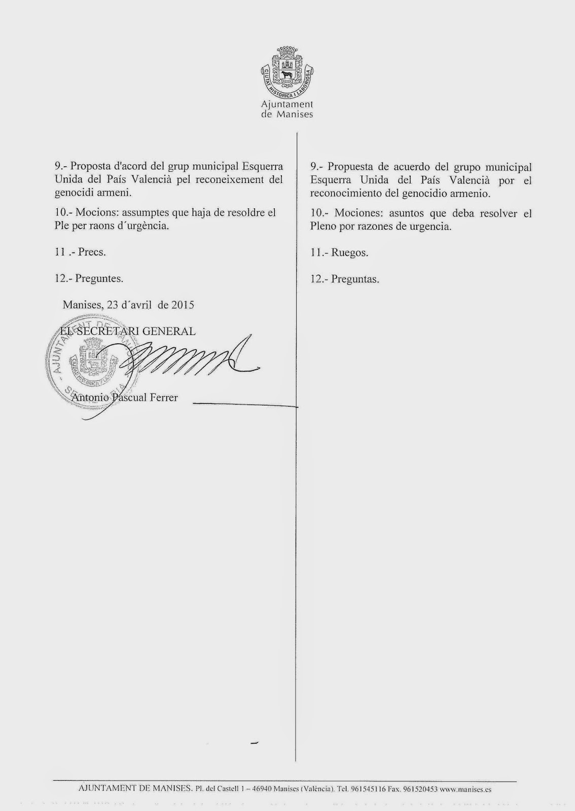 El pasado 28 de Abril del presente año, se celebró el pleno ordinario del Ayuntamiento de Nuestra Ciudad y que posiblemente sea el último de esta legislatura 2011-2015, ya que las elecciones locales tienen lugar el Domingo 24 de Mayo de 2015. Estas fotografías están tomadas este mismo día, para lo cual el pasado día 21 de Abril solicité -por escrito, en el registro de entrada en el Ayuntamiento, con carta dirigida al Sr. Alcalde- permiso para poder fotografiar el acto. Aprobada la solicitud les solicité a todos los grupos municipales permiso para poder hacerles unas fotografías, tanto individuales como generales, con el fin de tener un pequeño documento gráfico de los mismos, y poderlos incluir en la Historia de Manises en Imágenes que estoy preparando.