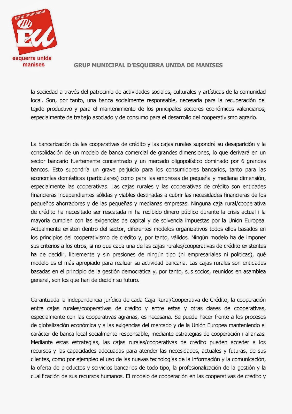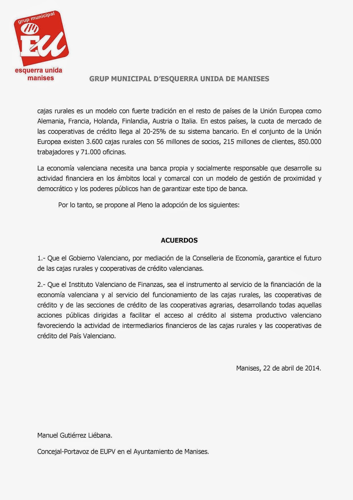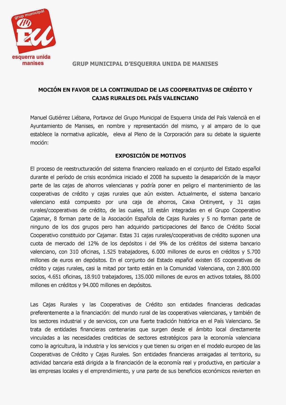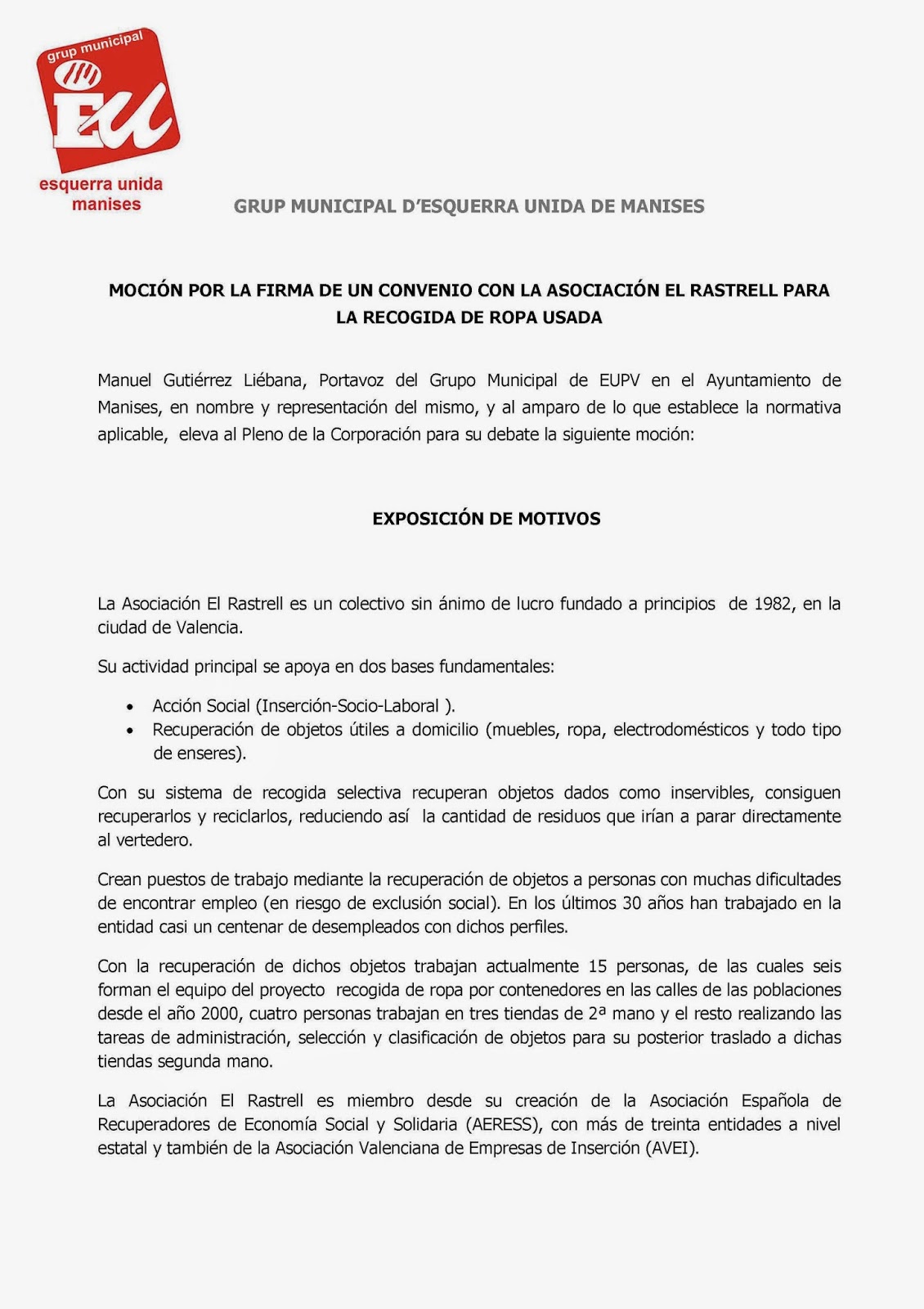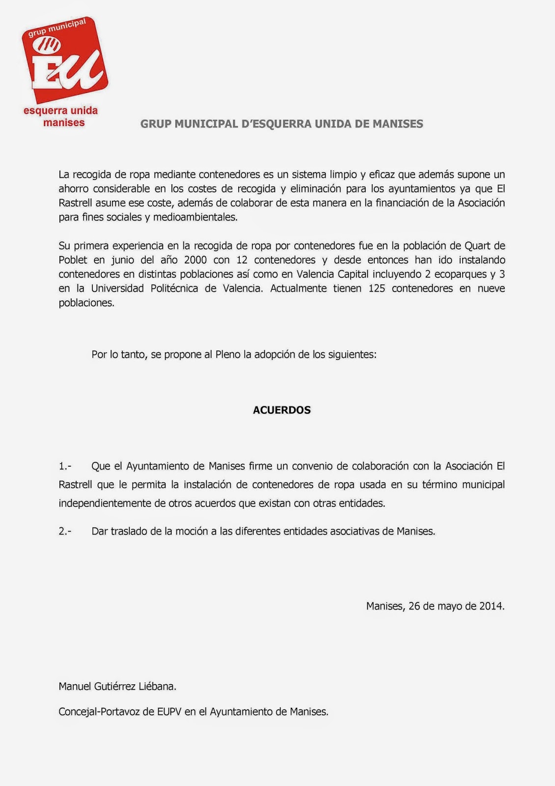 Mociones que se presentan al Pleno por parte de E.U. y que me han sido enviadas para su difusión, lo cual agradezco.