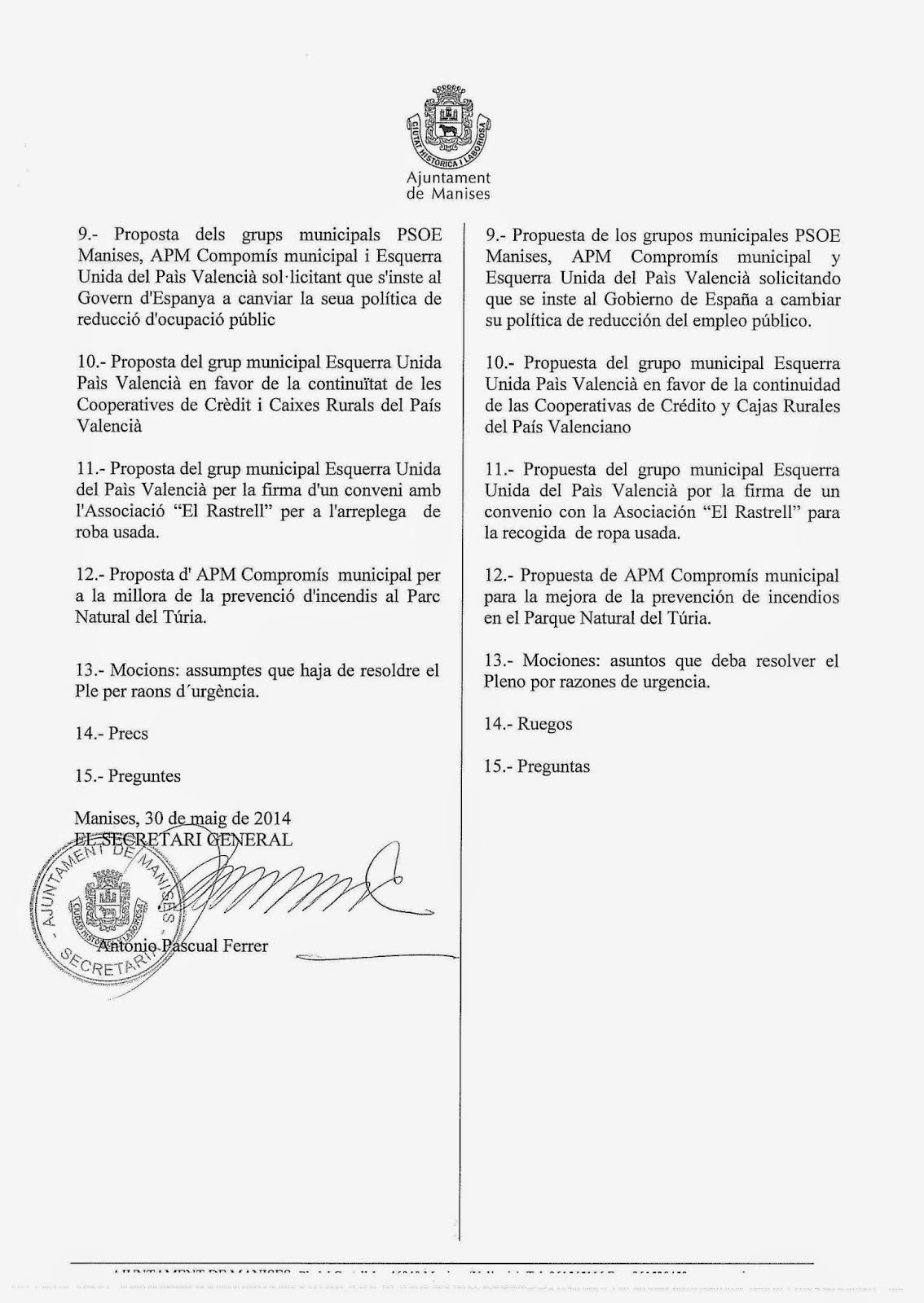 del Pleno del Ayuntamiento de Manises, para el Viernes día 30 de Mayo de 2014, a las 13:00 horas.