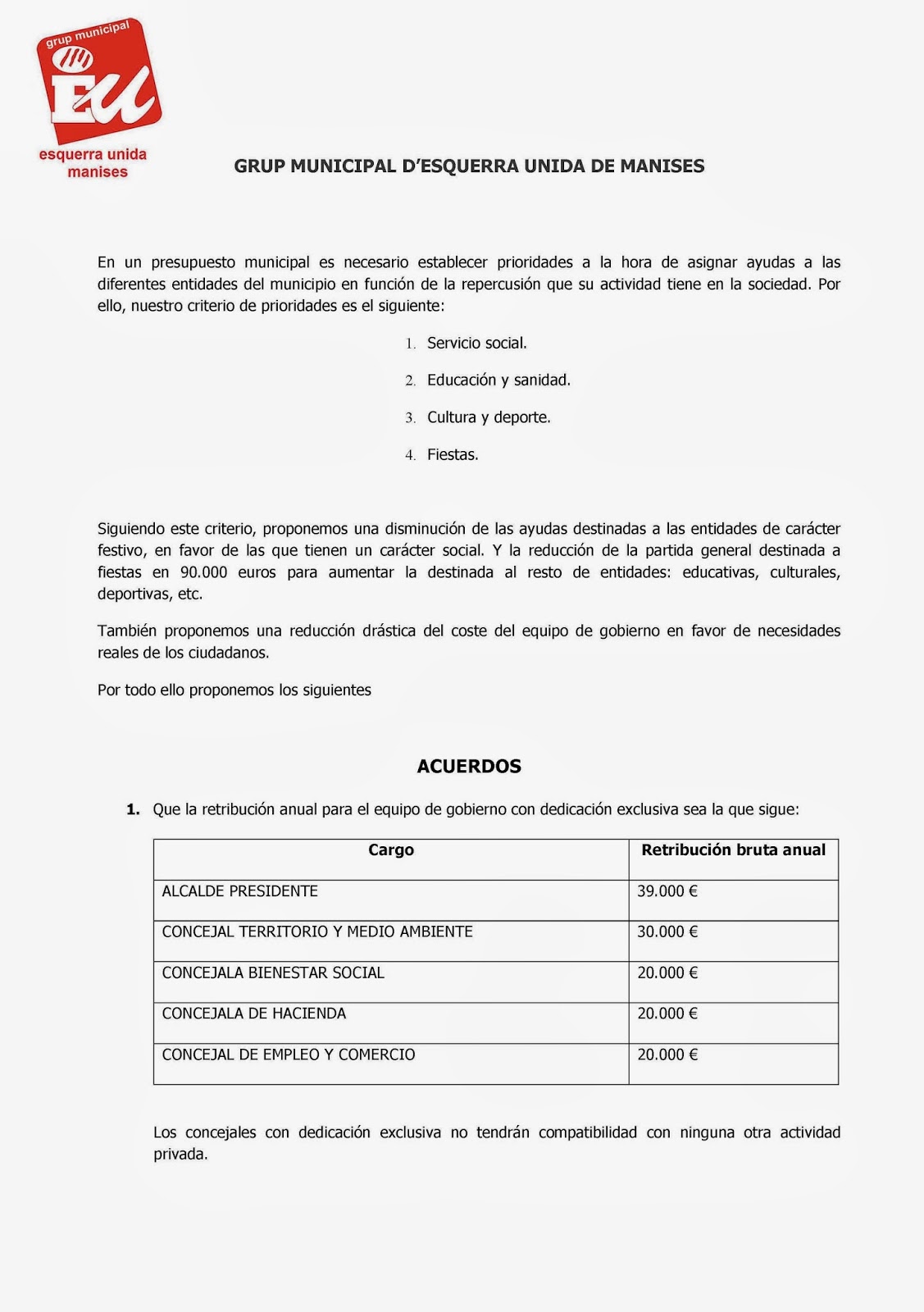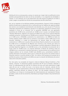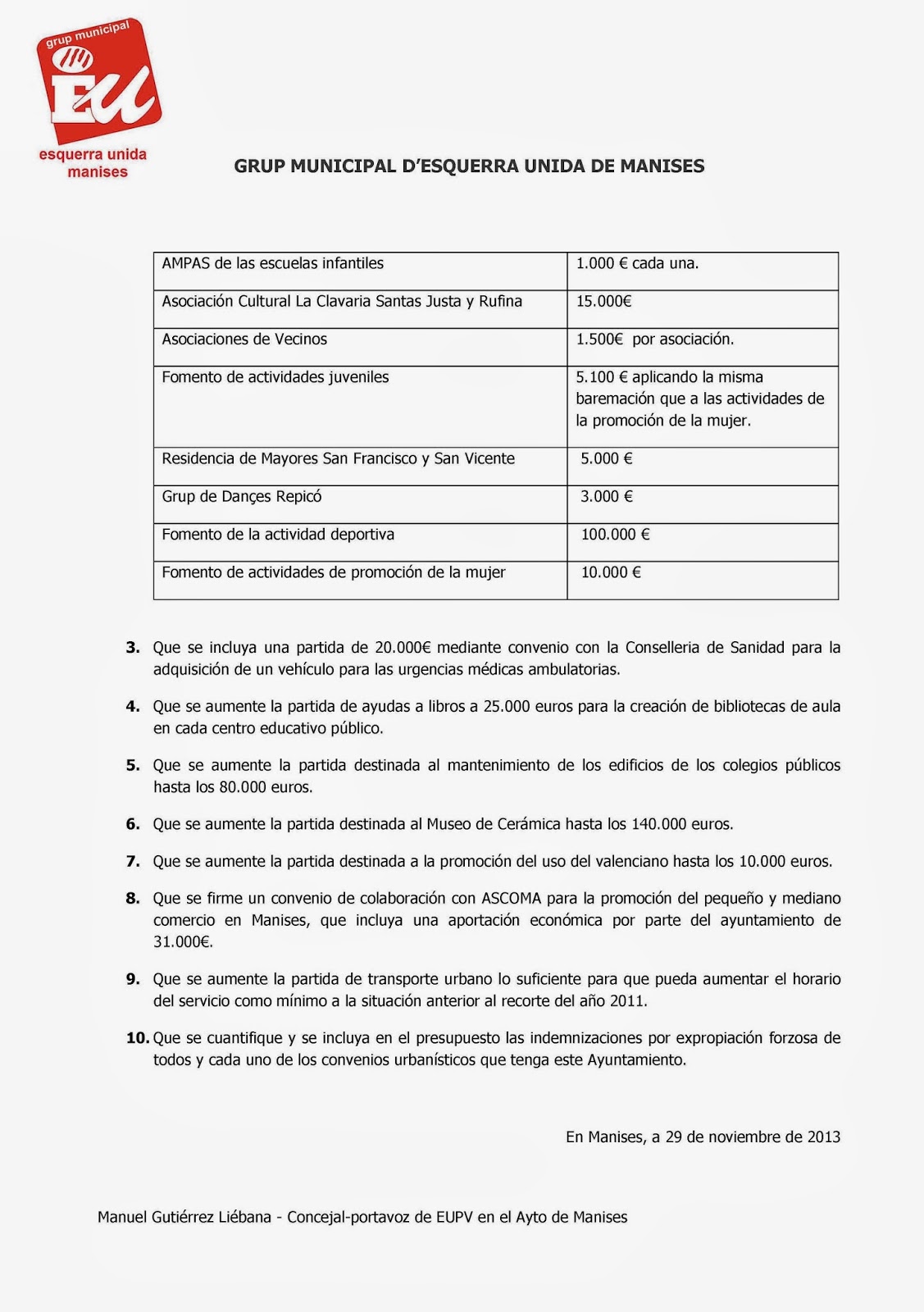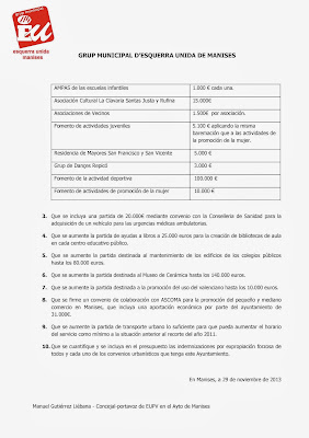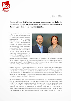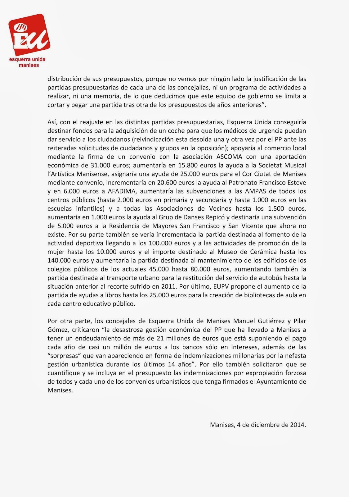 NOTA DE PRENSA QUE ENVÍA EU DE MANISES, SOBRE LA ENMIENDA A LOS PRESUPUESTOS DEL AYUNTAMIENTO DE MANISES DE 2014