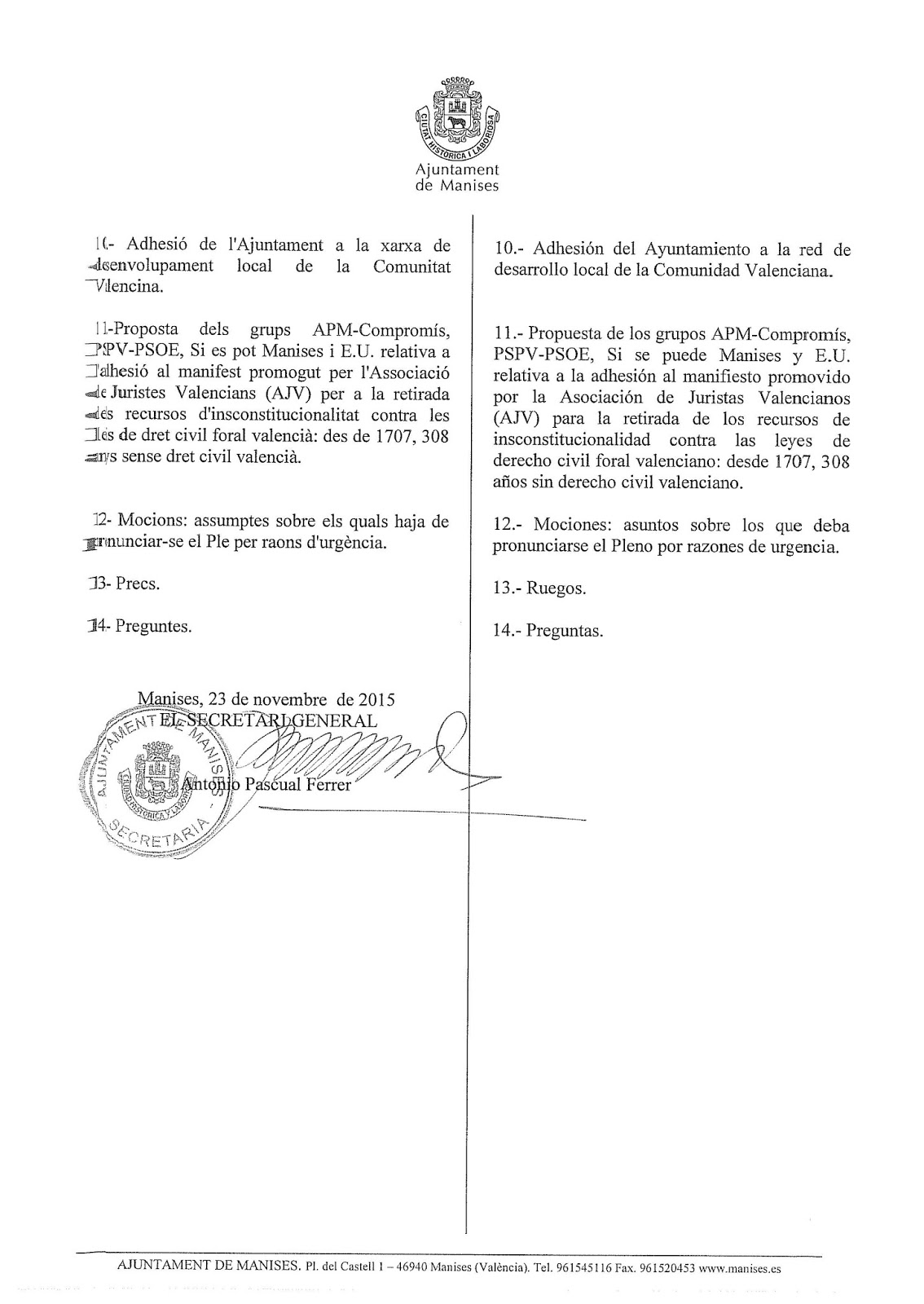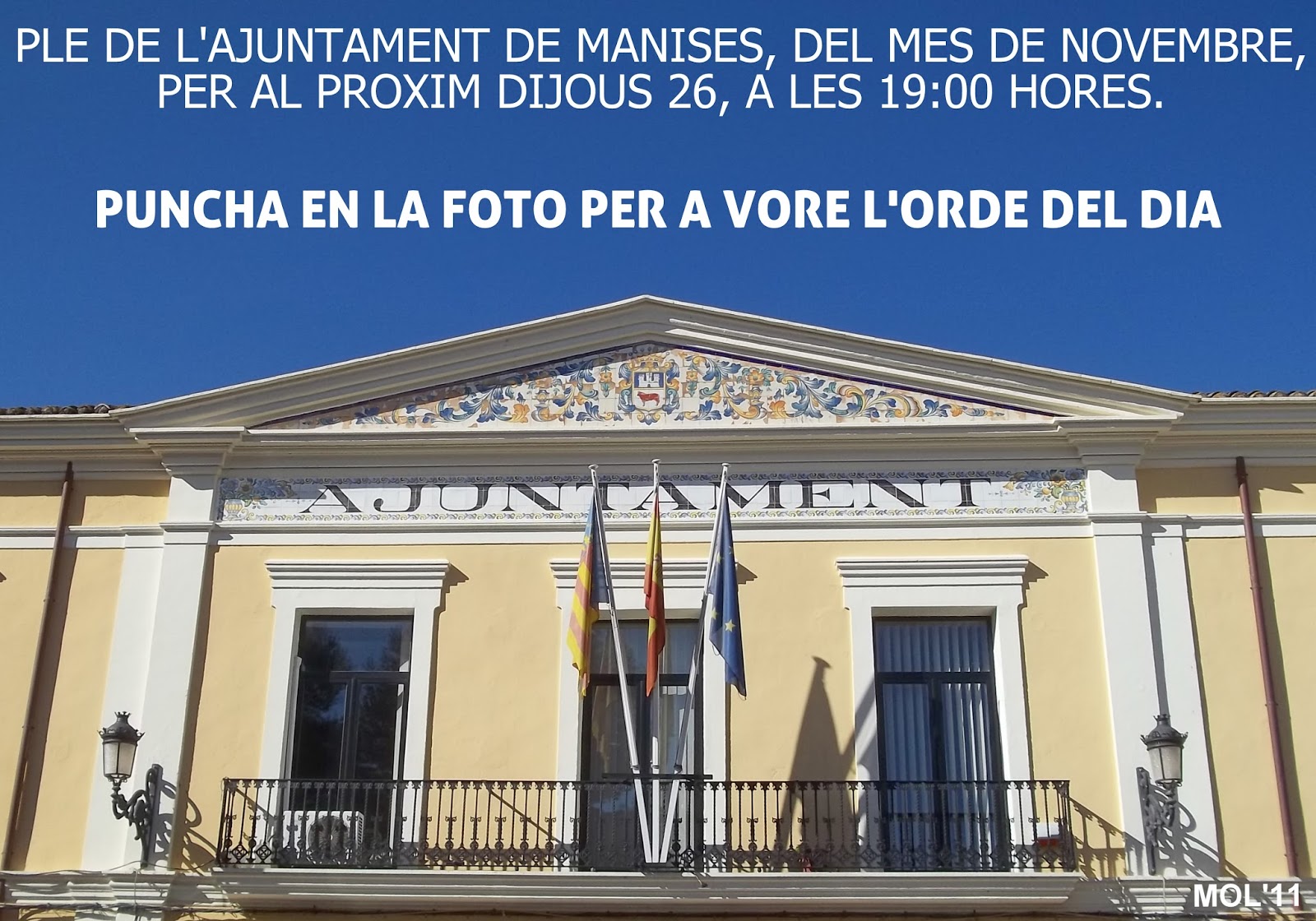 del Pleno del Ayuntamiento de Manises, que se celebra el Jueves día 26 de Noviembre, en el Salón de Actos de la Casa Consistorial, a las 19:00 horas.