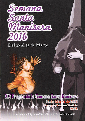 En su altar se han colocado los estandartes de las 4 Hermandades Maniseras, junto a la enseña de la Junta, y después de recoger a la entrada el tríptico que se había editado para la ocasión (este que ahora, a continuación, reproduzco) ha dado comienzo el solemne acto.