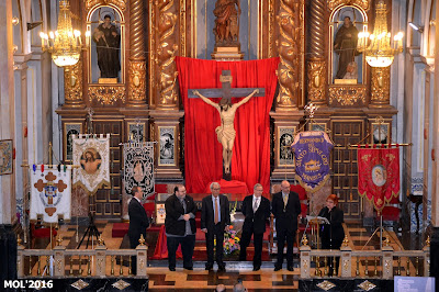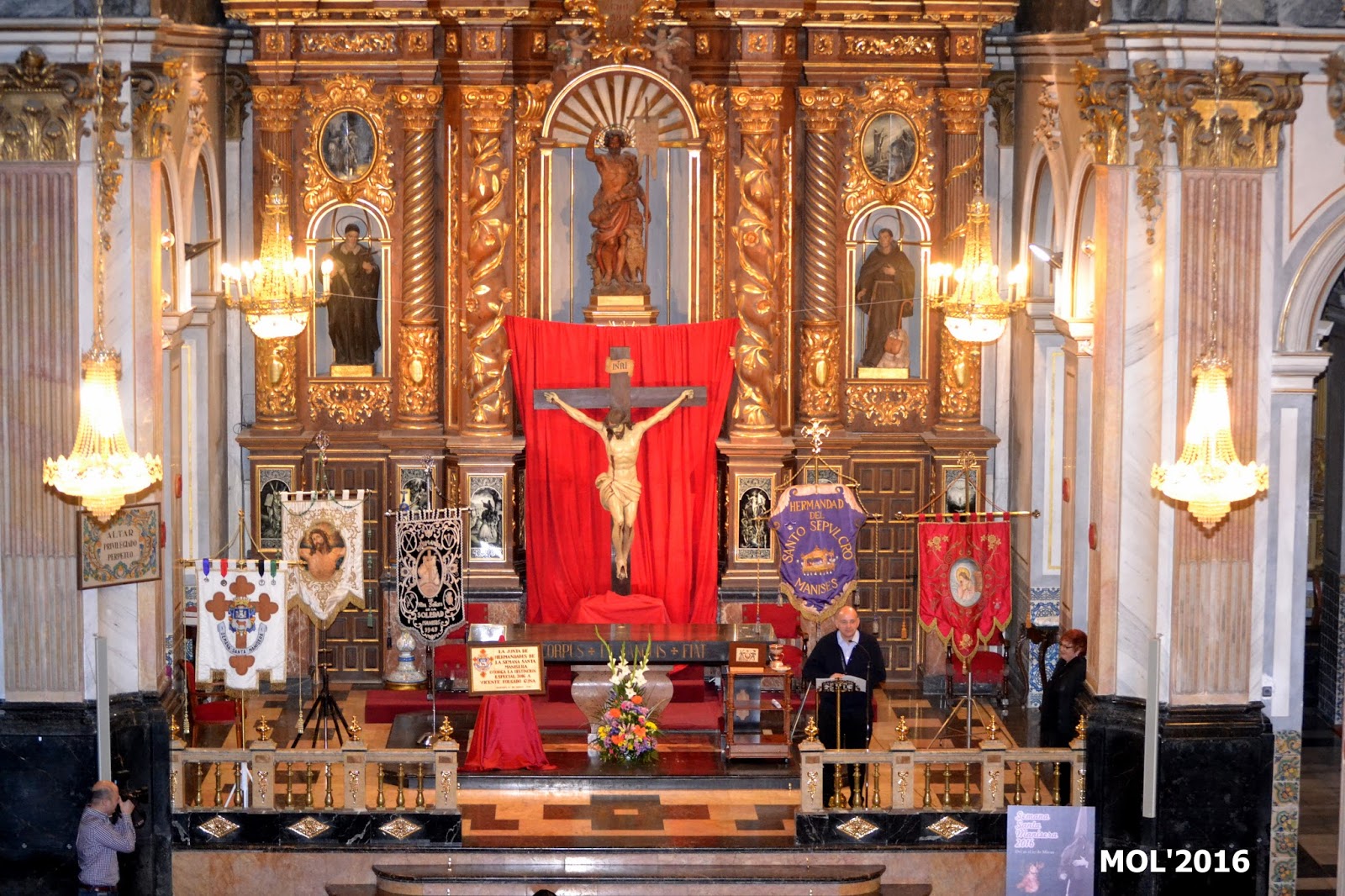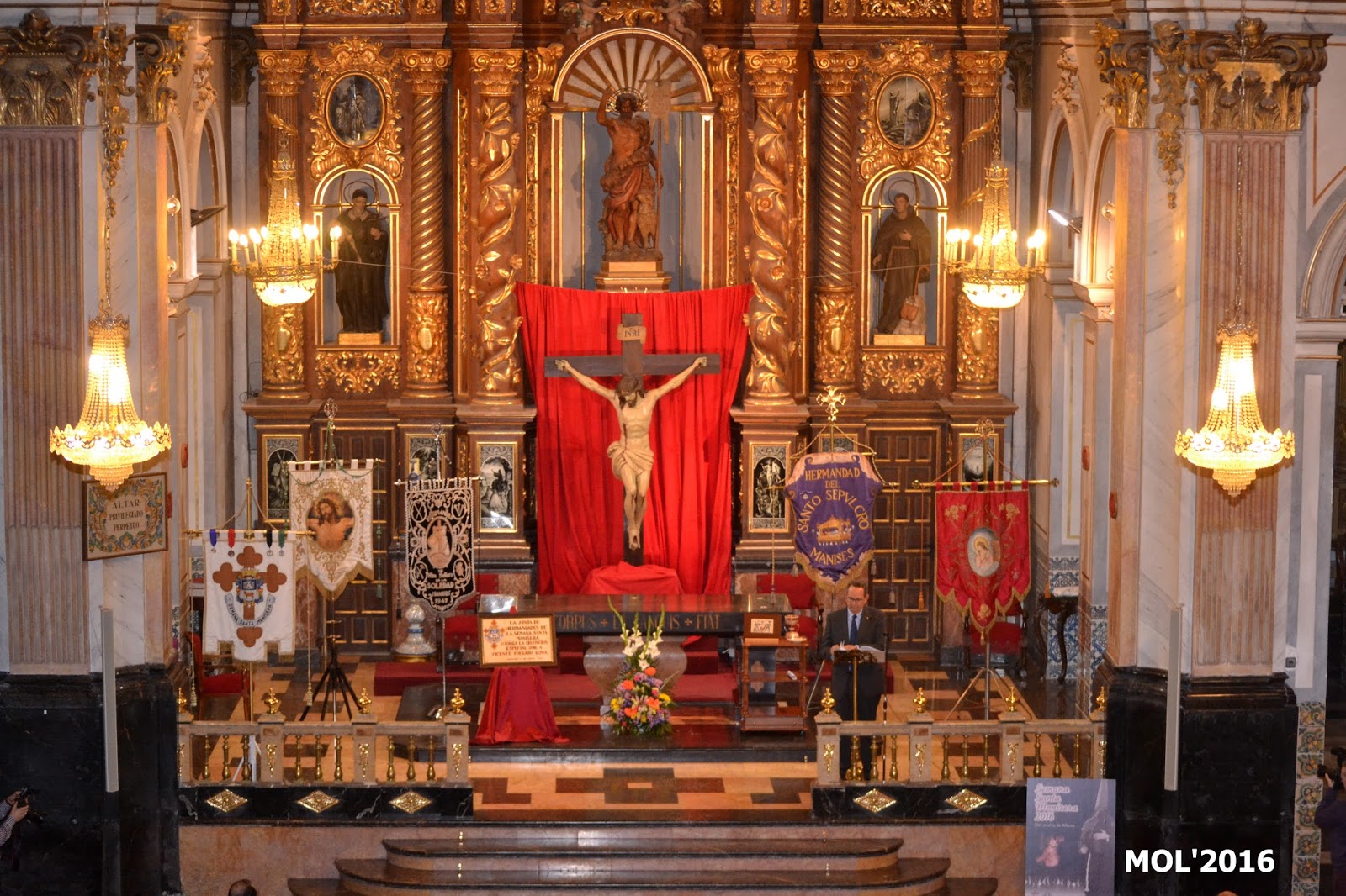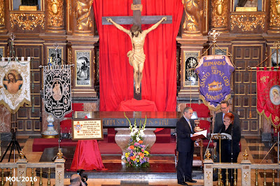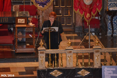 Amparo Suria, oficiando como presentadora, ha dado comienzo al acto leyendo unos hermosos versos dedicados a la figura del Crucificado y que presidía el Altar Mayor de la Iglesia.