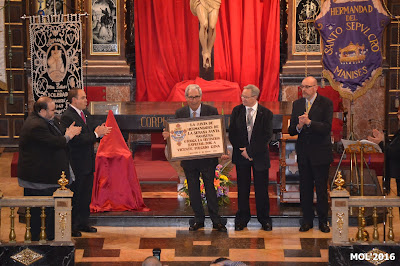 Paco Tos es obsequiado con un regalo por parte de la Junta de Hermandades por su discurso de Pregonero en esta Semana Santa de 2016.