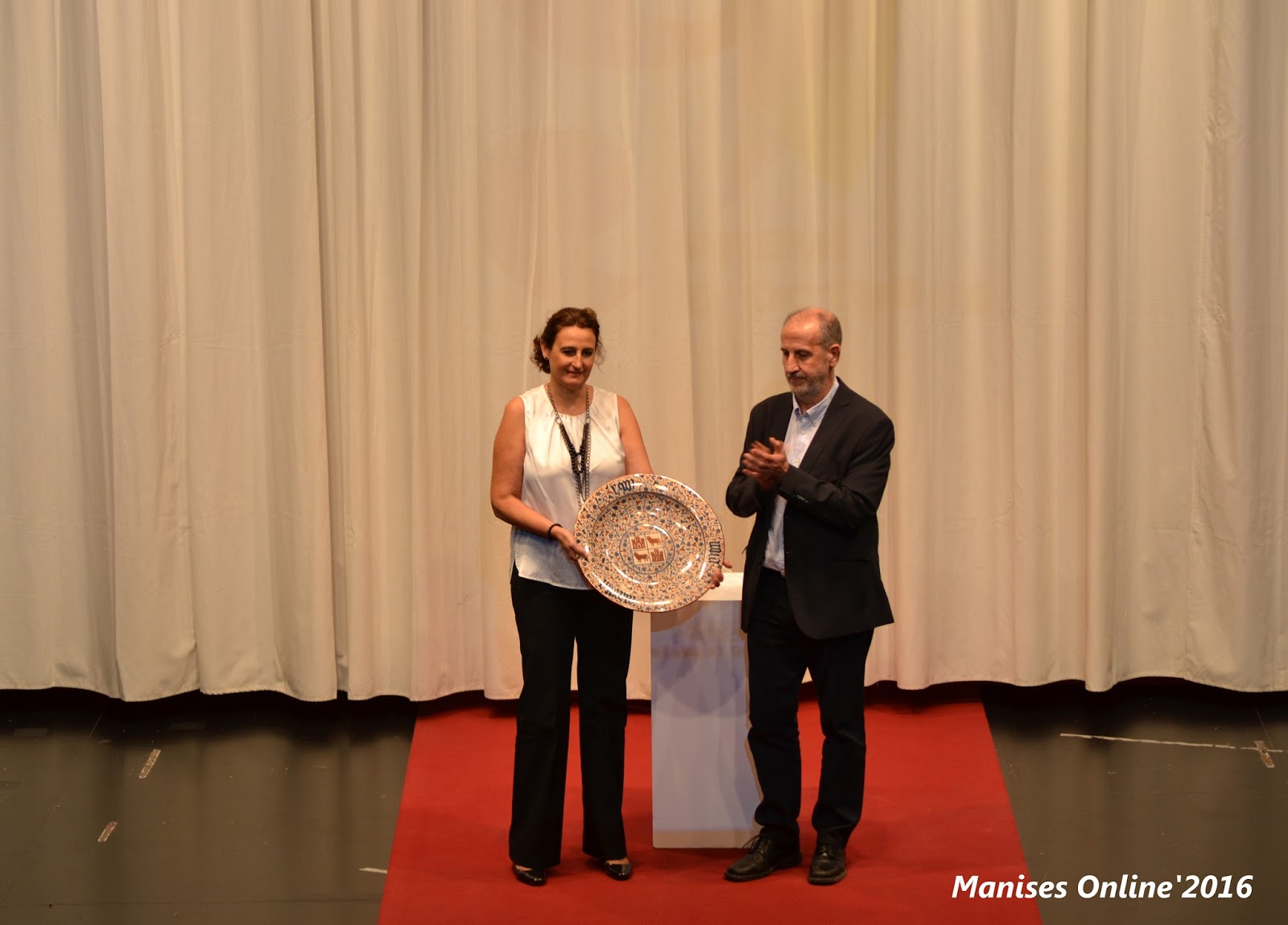 Una vez terminado de ver el vídeo la presentadora ha solicitado la presencia del Alcalde y de la Directora de la Escuela en el escenario. Allí el Alcalde Jesús Borrás, le ha hecho entrega a la Directora María José Sanz, de un plato de reflejo metálico, obra del ceramista manisero Arturo Mora, en reconocimiento a su labor pedagógica -durante los primeros cien años de la misma- con todos aquellos que han pasado por la escuela, y en nombre y representación -como homenaje- de los fundadores, maestros y ceramistas que ha tenido esta institución.