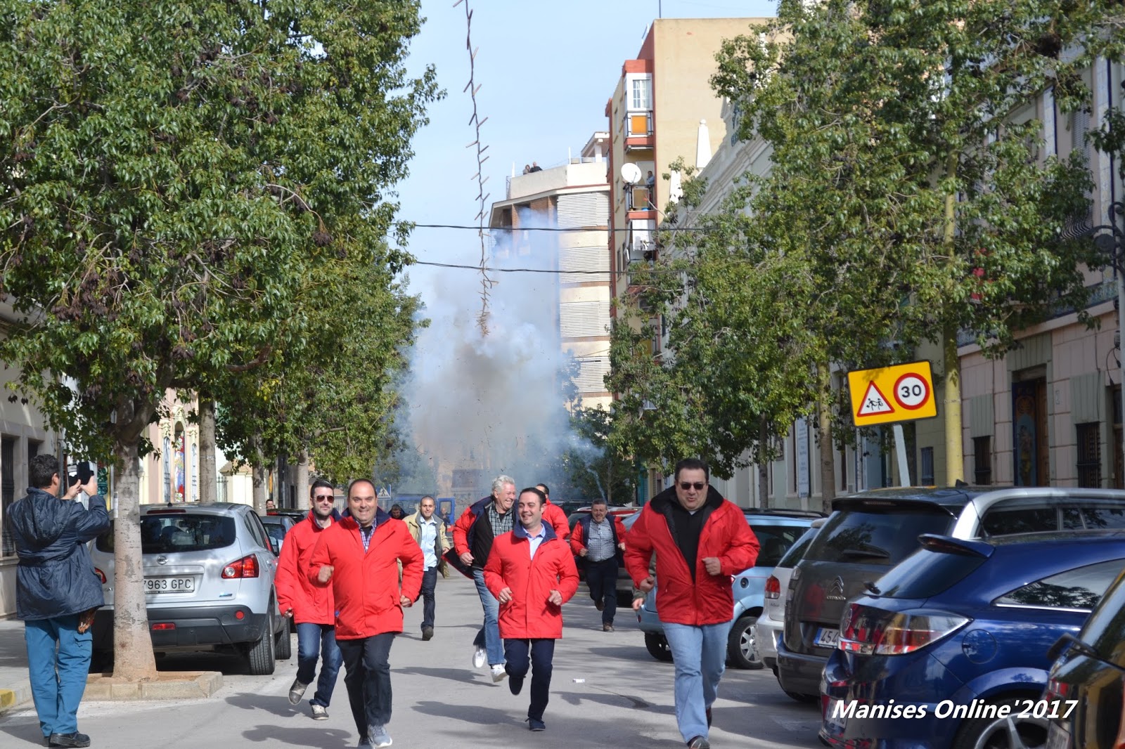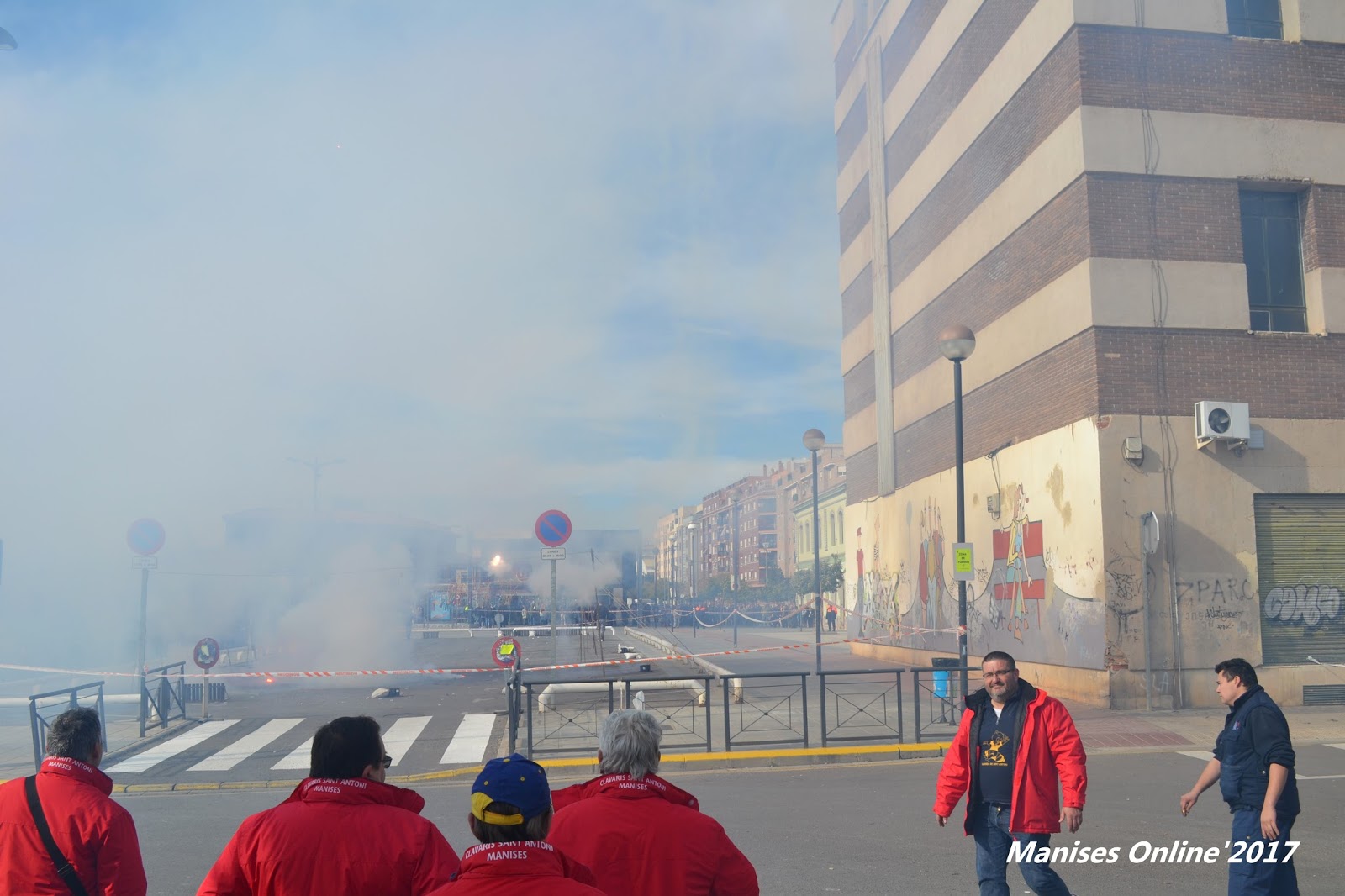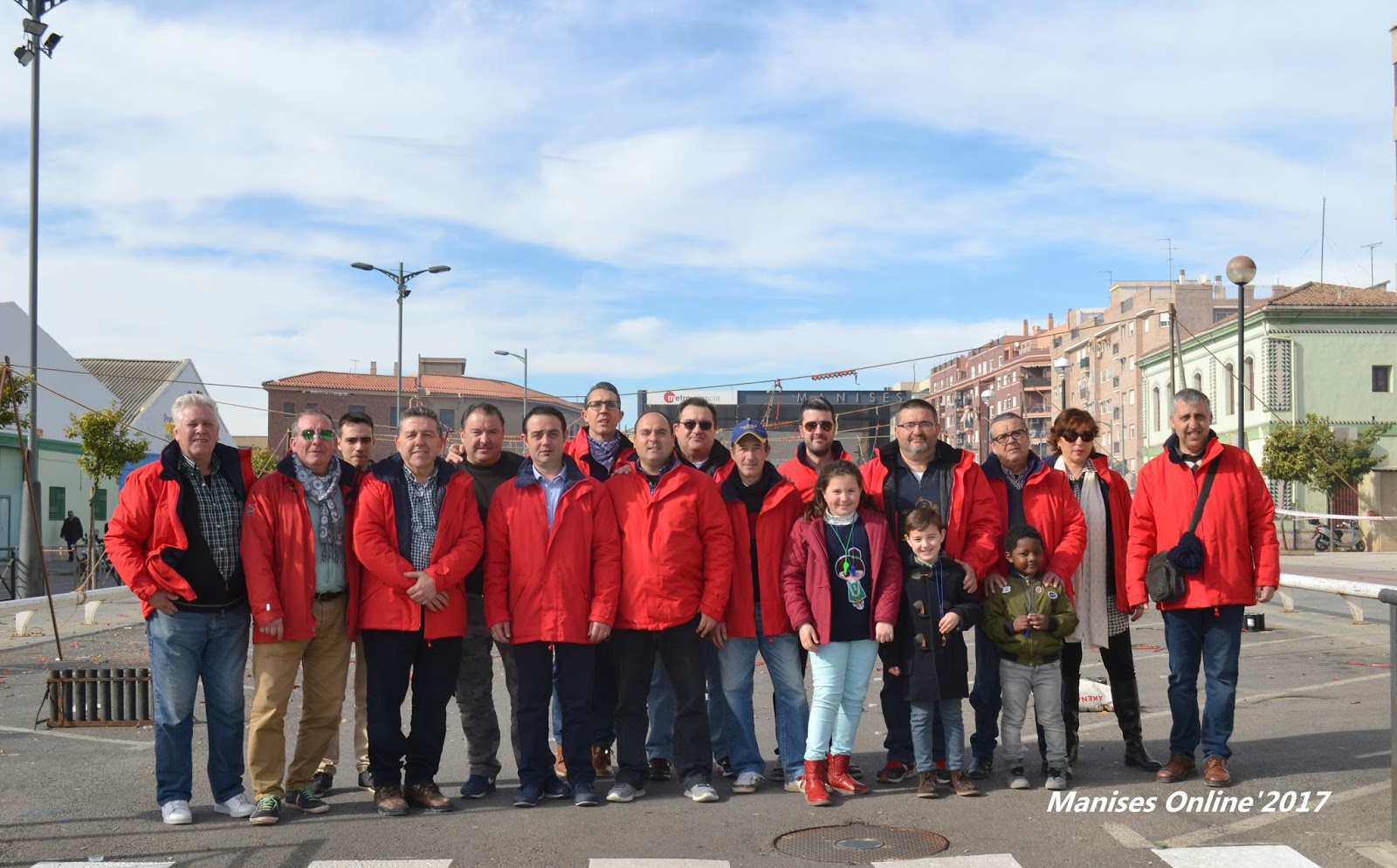 Los Clavarios y simpatizantes delante de la traca que iría a finalizar al aparcamiento del Metro, donde tuvo lugar la mascletà.