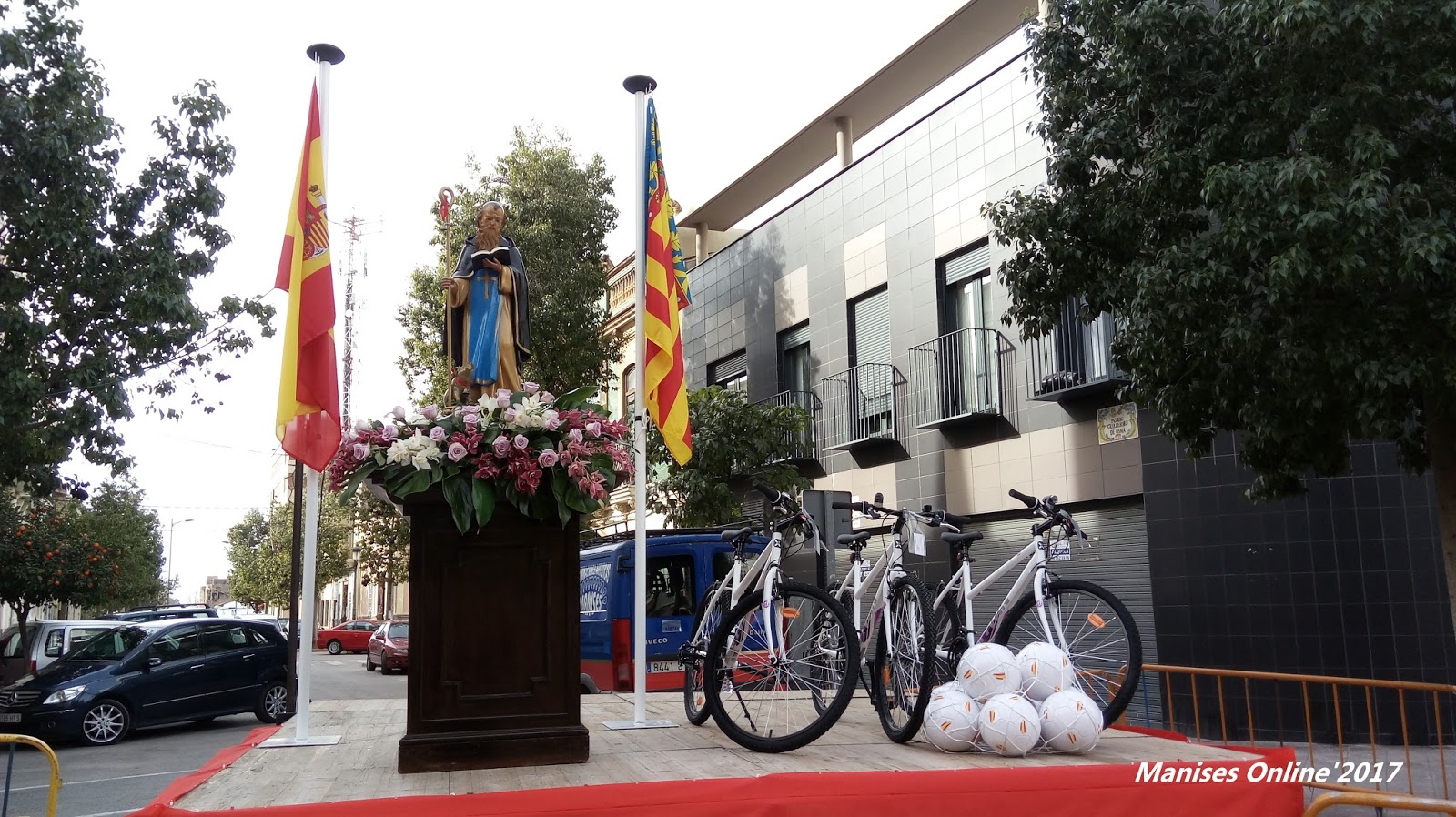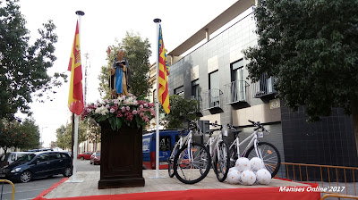 Junto a la imagen del Santo se habían colocado 3 bicicletas y 10 balones de fútbol de la selección española, que fueron entregados a los afortunados que les había tocado en el sorteo con los números (gratis) que se entregaban en el momento se hacía entrega de la bolsas con golosinas.