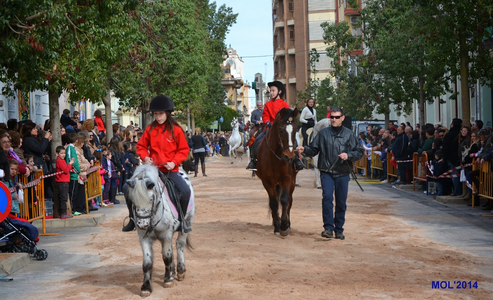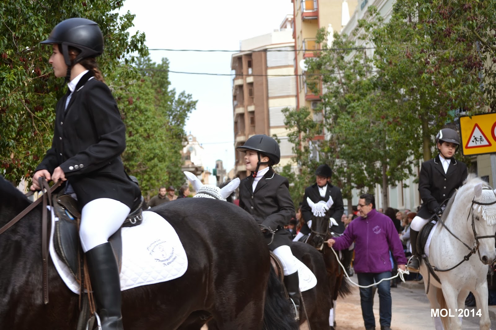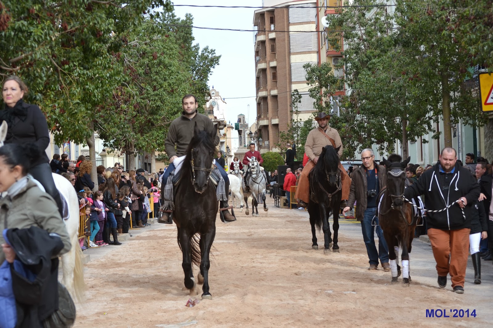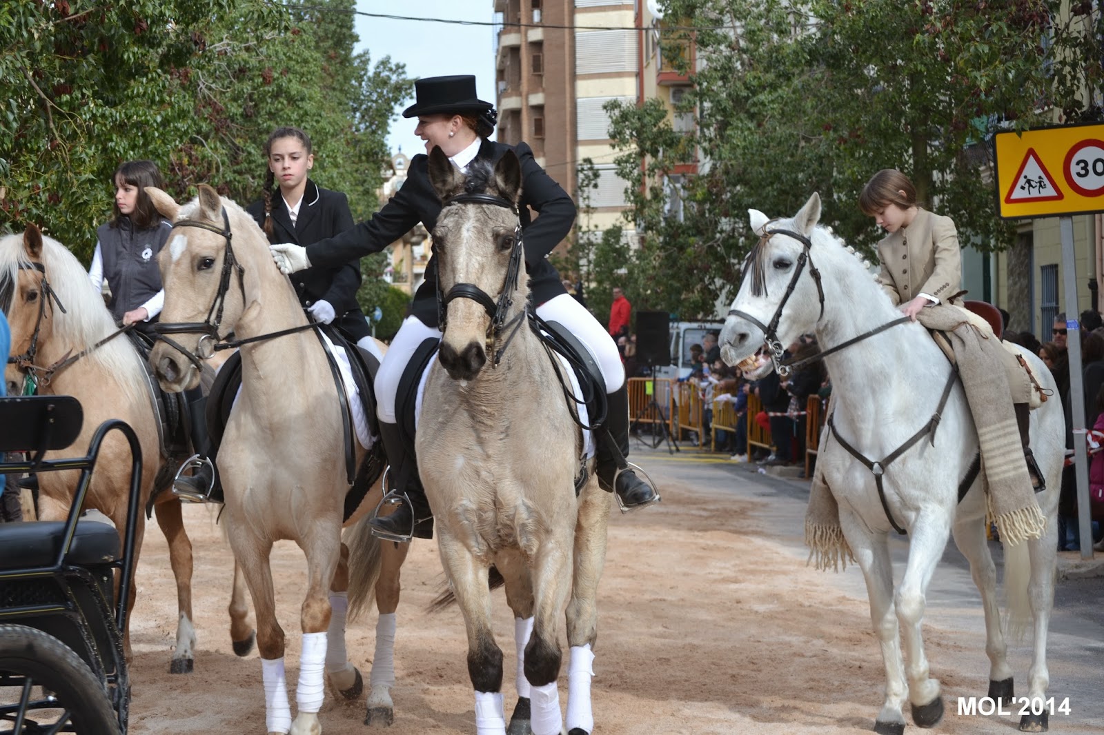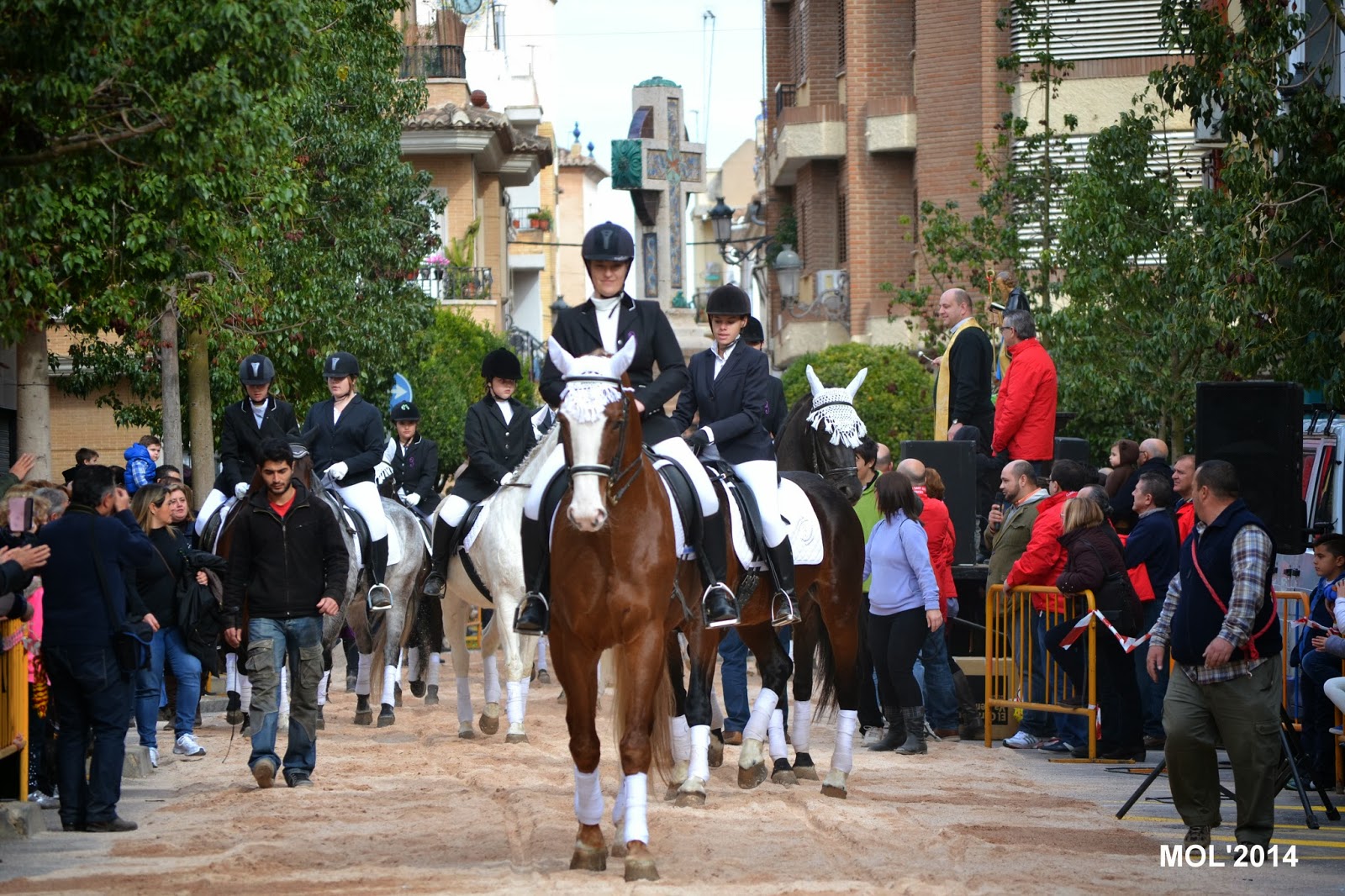 Una vez terminada la bendición de los animales domésticos, le llegó el turno a los caballos y caballerizas, que con gran elegancia y vistosidad fueron desfilando. Un locutor iba explicando qué es lo que hacían, cómo iban vestidos los jinetes y a que cuadra pertenecían. Antes de comenzar la Avda. de Blasco Ibáñez, lugar de concentración, era un inmenso mar de personas y caballos mezclados que esperaban impacientes el desfile, para poder mostrar a los presentes su dotes en el manejo de la equitación y las amazonas, algunas muy jóvenes, que fueron aplaudidas por todo el público asistente.