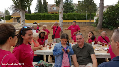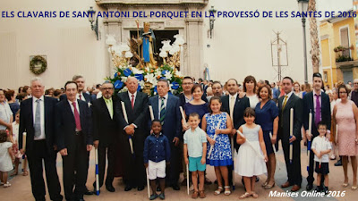 Este detalle al que me refiero es el que han tenido los clavarios de 2016-2017 en invitar a la procesión, presidiéndola, a una persona que durante muchos años, tanto él como su familia, fueron clavarios de San Antonio: Ramón Gimeno Galarza, y que durante años, y como Presidente, elevó (acompañado por su Junta Directiva) la fiesta a cuotas muy altas y de gran repercusión tanto en Manises como en los pueblos del alrededor. No hay más que recordar las excelentes noches de conciertos que se celebraban todos los años en estas fechas. En la fotografía tomada el día 19 de Julio de 2016, en la Plaza de la Iglesia, antes de la procesión lo vemos el quinto por la izquierda. A su izquierda el Presidente actual Vicente Díez Calatrava.