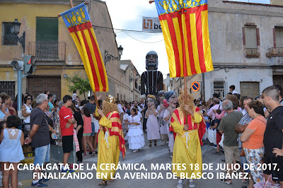 Uno de los días grandes de las fiestas de Manises es: LA CABALGATA DE LA CERÁMICA. Esta ha tenido lugar el martes día 18 de Julio, y ha salido desde la calle Molí de la Llum para terminar en la Avda. de Blasco Ibáñez. Ha cruzado prácticamente toda la Ciudad entregando (gratuitamente) a los visitantes y maniseros que se han acercado, miles de piezas de cerámica que se ha recogido tanto de los centros con los que la Clavaria tiene un convenio de colaboración, como de las fábricas a las que se les han comprado las piezas para regalarlas.