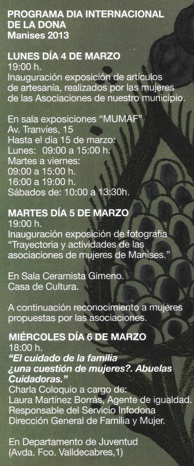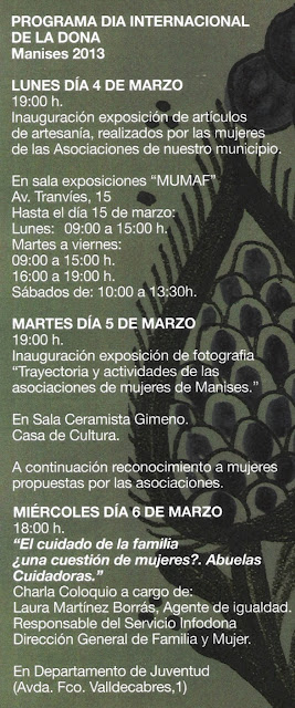 Treballs manuals, exposicicions, coloquis, manifests, i el PREMI A TOTA UNA VIDA, son les activitats que est any s’han preparat pels colectius.