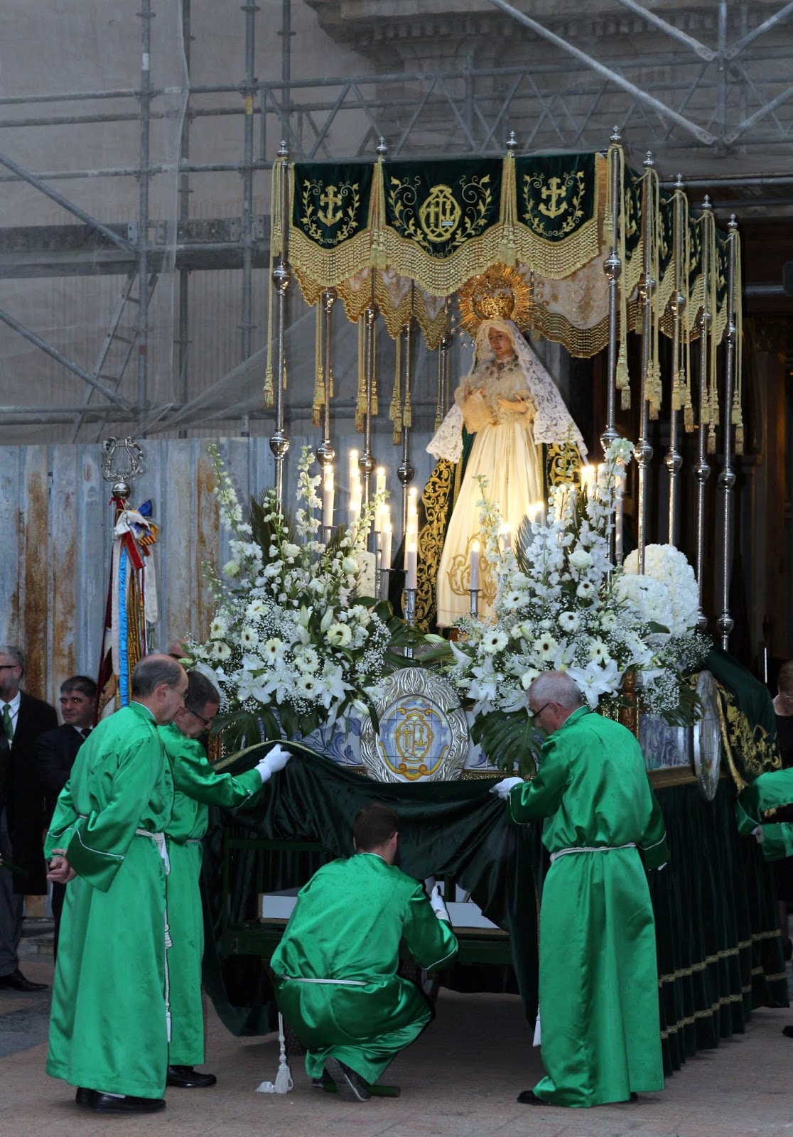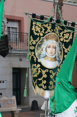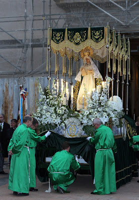 He podido conseguir estas fotos que ilustran esta entrada y en las que se pueden ver algunas imágenes de la Virgen de la Esperanza saliendo de la Iglesia de San Juan Bautista: