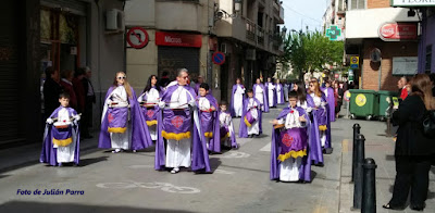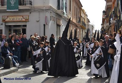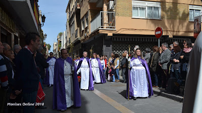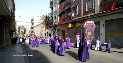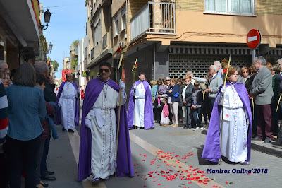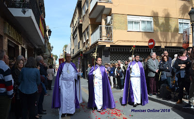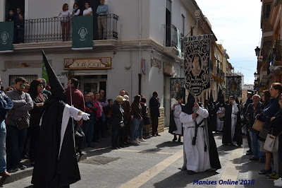 En primer lugar es para la Hermandad del Santo Sepulcro (Els Morats), que abren la procesión y a continuación la Hermandad de la Flagelación (Els Rojos), a la que le toca este año. El itinerario es: Calle del Dr. Fleming, Calle Mayor hasta llegar a la Plaza de la Iglesia.