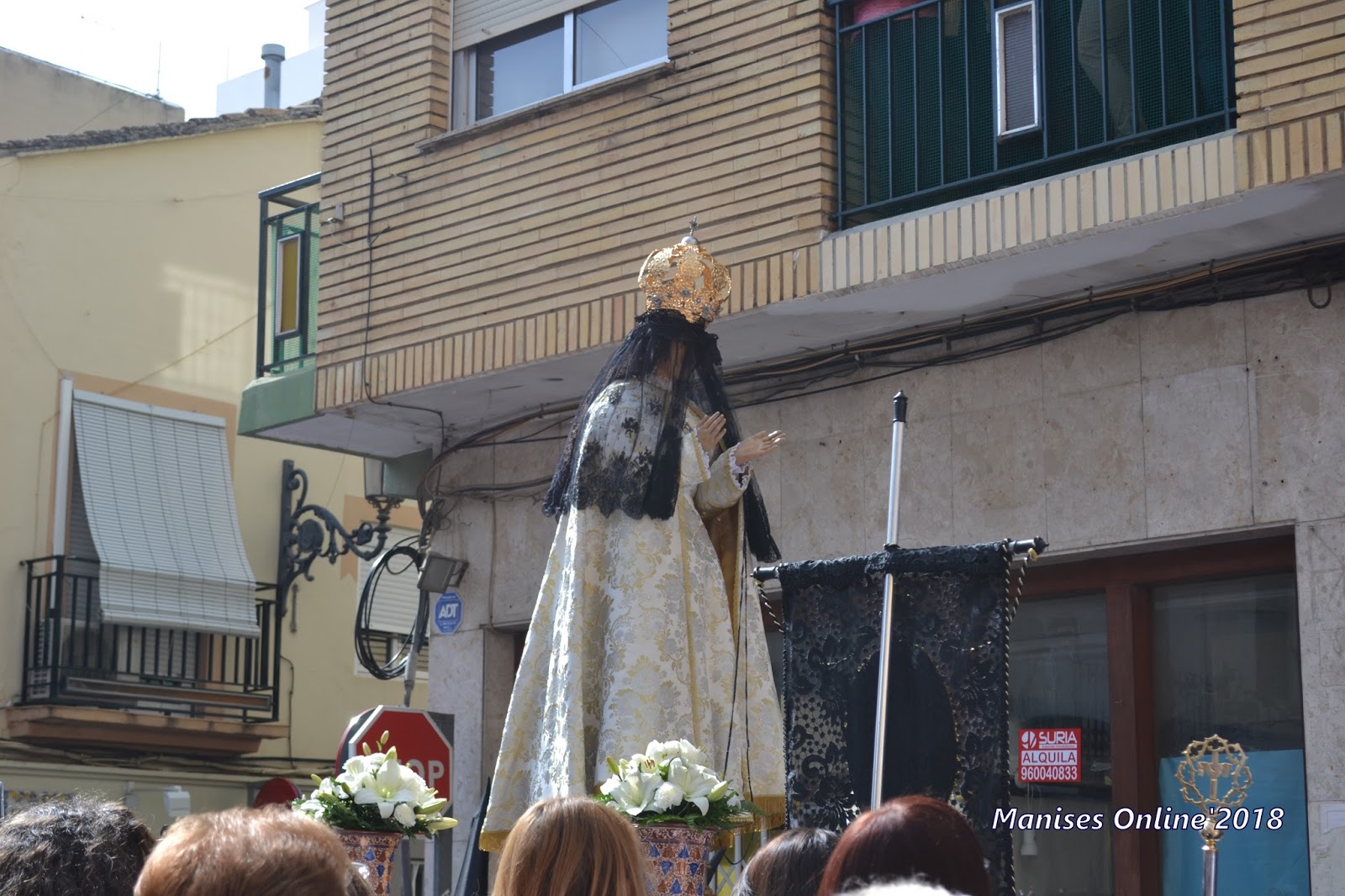 LLEGADA A LA PLAZA DE LA IGLESIA POR LA CALLE MAYOR. HERMANDAD DE LA ESPERANZA Y A CONTINUACIÓN LA HERMANDAD DE LA SOLEDAD, CON LA VIRGEN.
