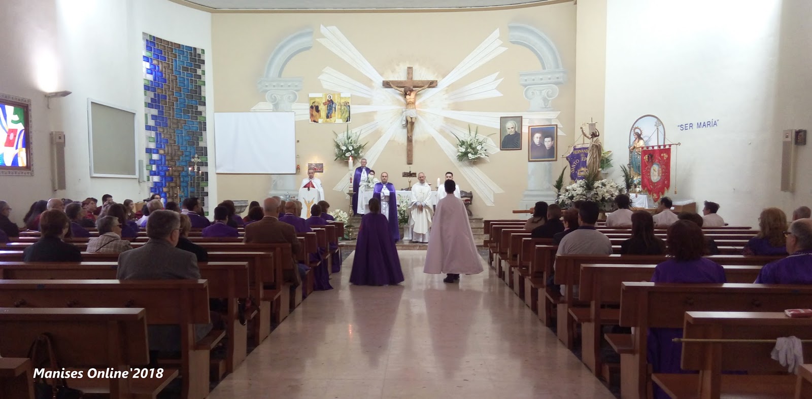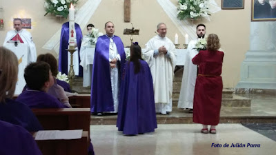 La Hermandad de la Flagelación (Els Rojos) y la del Santo Sepulcro (Els Morats) nos reunimos en la Parroquia del Inmaculado Corazón de María y allí tiene lugar la Santa Misa, en la que participan activamente los hermanos de las dos cofradías.