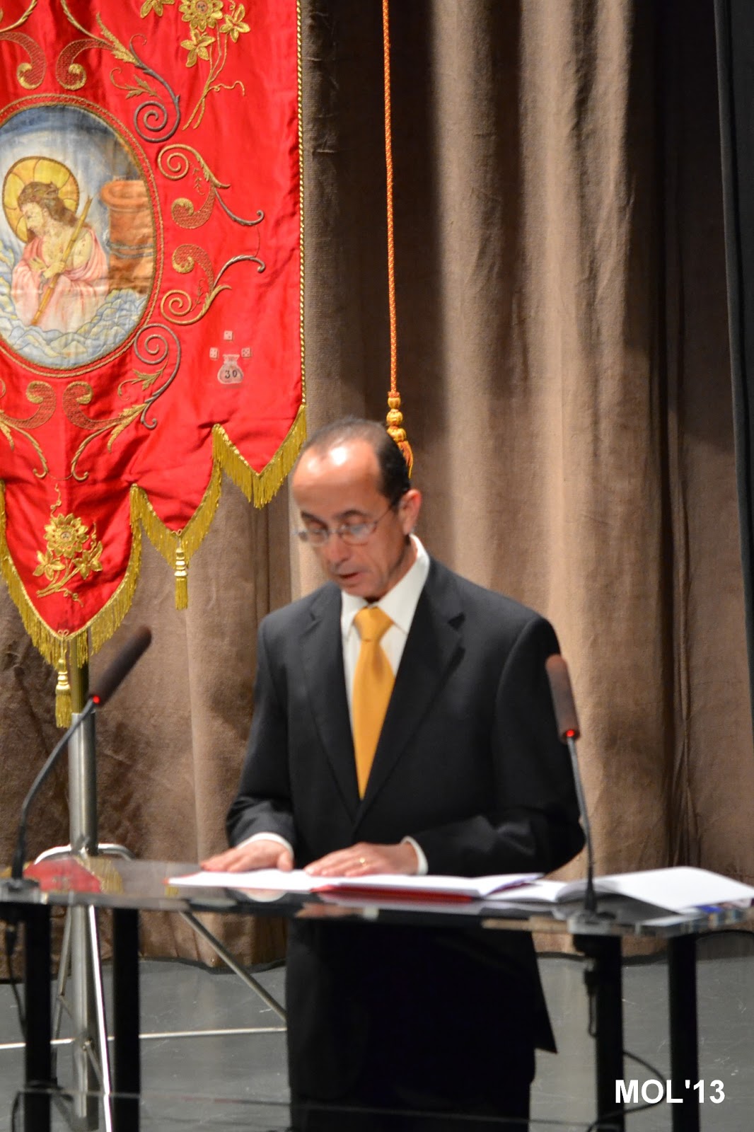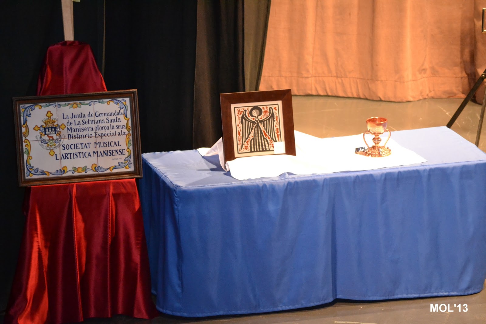 El presentador Sr. Tos, requiere la presencia del Secretario de la Junta de Hermandades, pero es Ramón Marí, el que lee el acta en la que se distinguía a la S. M. La Artística Manisense, en este 2013, por su labor educativa y musical en Manises.
