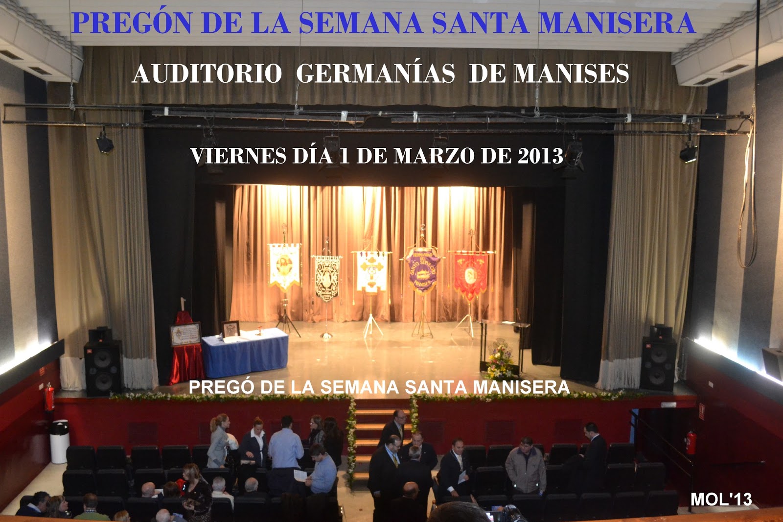 En el Auditorio Germanías de Manises, tuvo lugar el pasado viernes día 1 de Marzo, el acto preliminar y que marca el inicio de la Semana Santa Manisera.