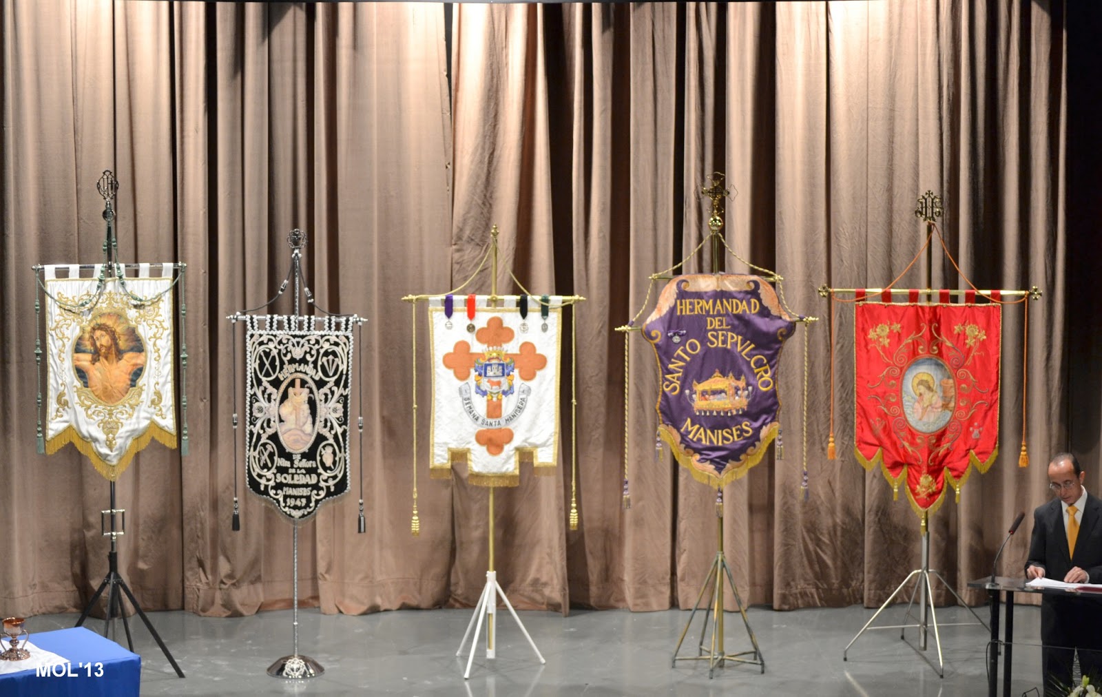 En un escenario (que pueden ver) en el que sobriamente se mostraban los estandartes de las cuatro Hermandades que en la actualidad existen en Manises, junto a los obsequios que se iban a entregar, dio comienzo el acto.