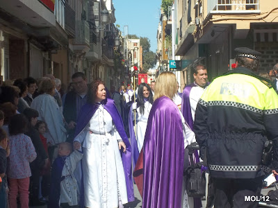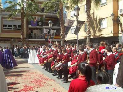 La hermandad de la Flagelación » Els Rojos «, y del Santo Sepulcro » Els Morats «, han comenzado el día con una Misa en la Parroquia del Inmaculado Corazón de María, para posteriormente -con la imagen del Resucitado- dirigirse por la Calle Dr. Fleming y Major, a la Iglesia de San Juan Bautista.