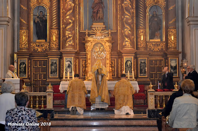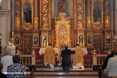 Después de las palabras de Don Mariano, en las que ha recordado el motivo de esta celebración y ha exhortado a los feligreses a seguir el camino de la oración y las enseñanzas del Evangelio, la Eucaristía -bajo palio-ha sido trasladada al altar que se había preparado a la entrada de la parroquia. Allí han tenido lugar las oraciones propias de la celebración y se ha cantado el tradicional motete, que como hace años ha sido cantado por Mer Botet, acompañada por la pequeña orquesta y el órgano.