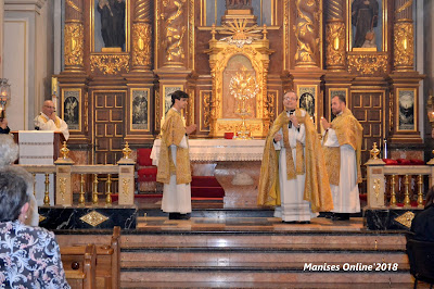 Tres sacerdotes, mejor dicho dos diáconos: Juan Pérez Díe, Don Mariano Ruiz Campos, Rector del Patriarca, y el diácono José Gómez Marín, han concelebrado la solemne Noventa y Exposición del Santísimo.