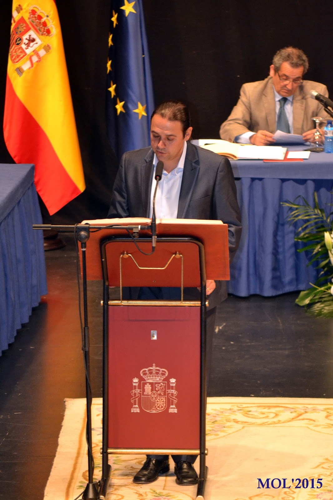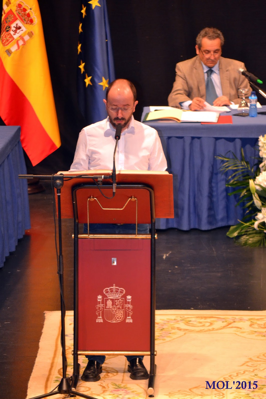 Aplegat a este punt, la taula constituïda: D’esquerra a dreta el Secretari de l’Ajuntament, Sr. D. Antonio Pascual Ferrer, en el centre la senyoreta Altea Royo Vila (la mes jove dels regidors) i per ultim Jesús Borràs Sanchis (el de mes edat), començaren a nomenar a tots els elegits per a que pogueren pendre possessio del carrec, per a lo que s’havia dispost -en el centre de l’escenari- una tarima on s’encontrava un eixemplar de la Constitució Espanyola per a que tots pogueren Jurar, Prometer o atra formula que -dins de la llegalitat- pogueren usar els nous regidors.