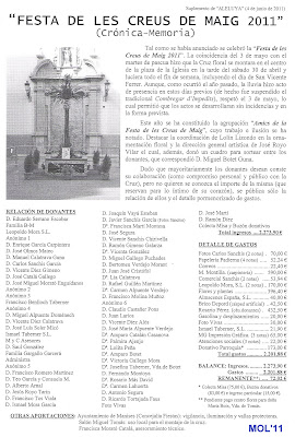 Ayer día 9 de Junio, a las 21:00 horas, tuvo lugar la cena dels «Amics de Les Creus de Maig «. La cena pagada a escote por cada uno de los asistentes, se celebró en el Hogar del Pensionista y fue la ocasión para dar cuentas de los ingresos y gastos que se habían originado en este ejercicio de 2010-2011.