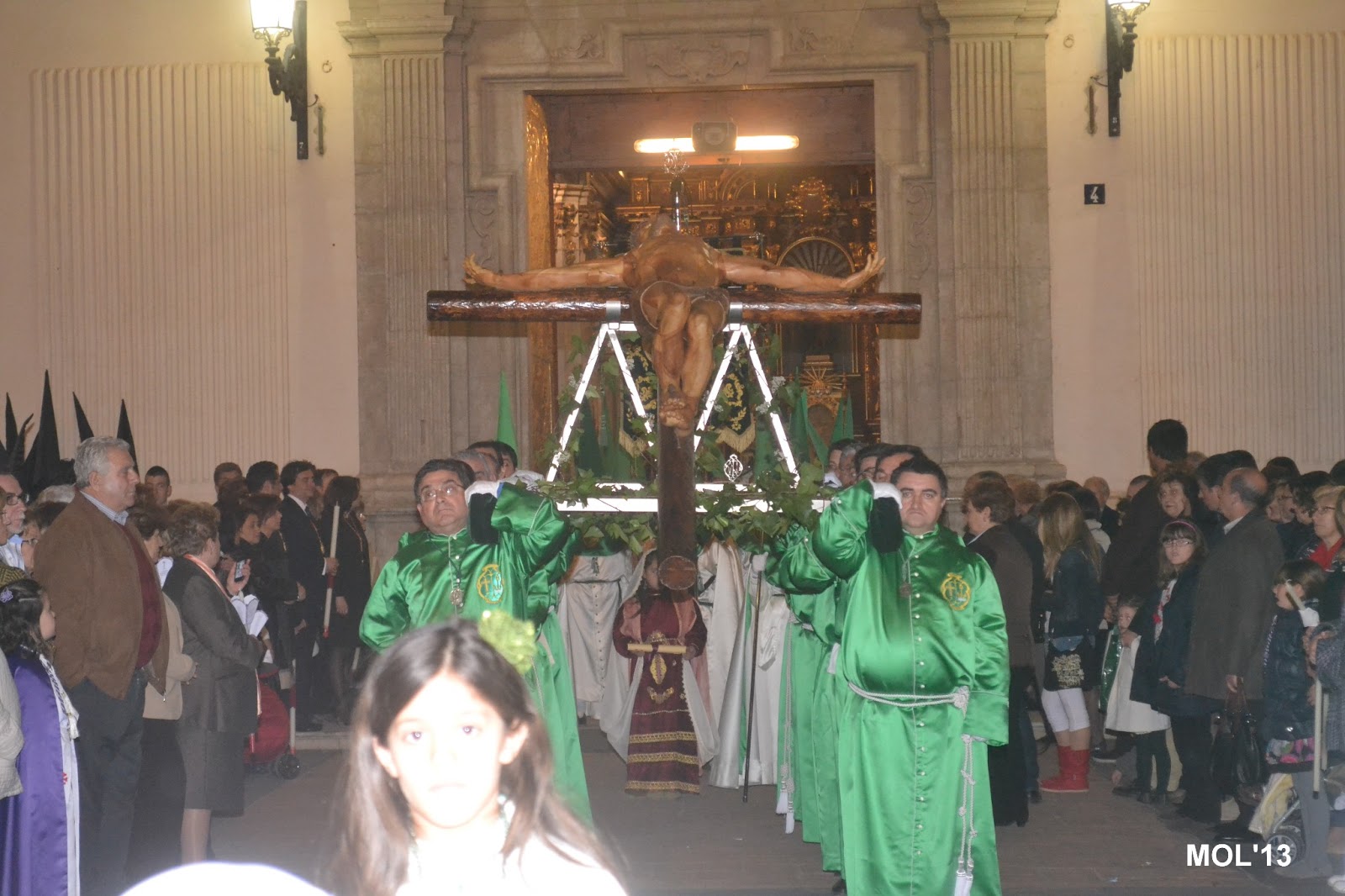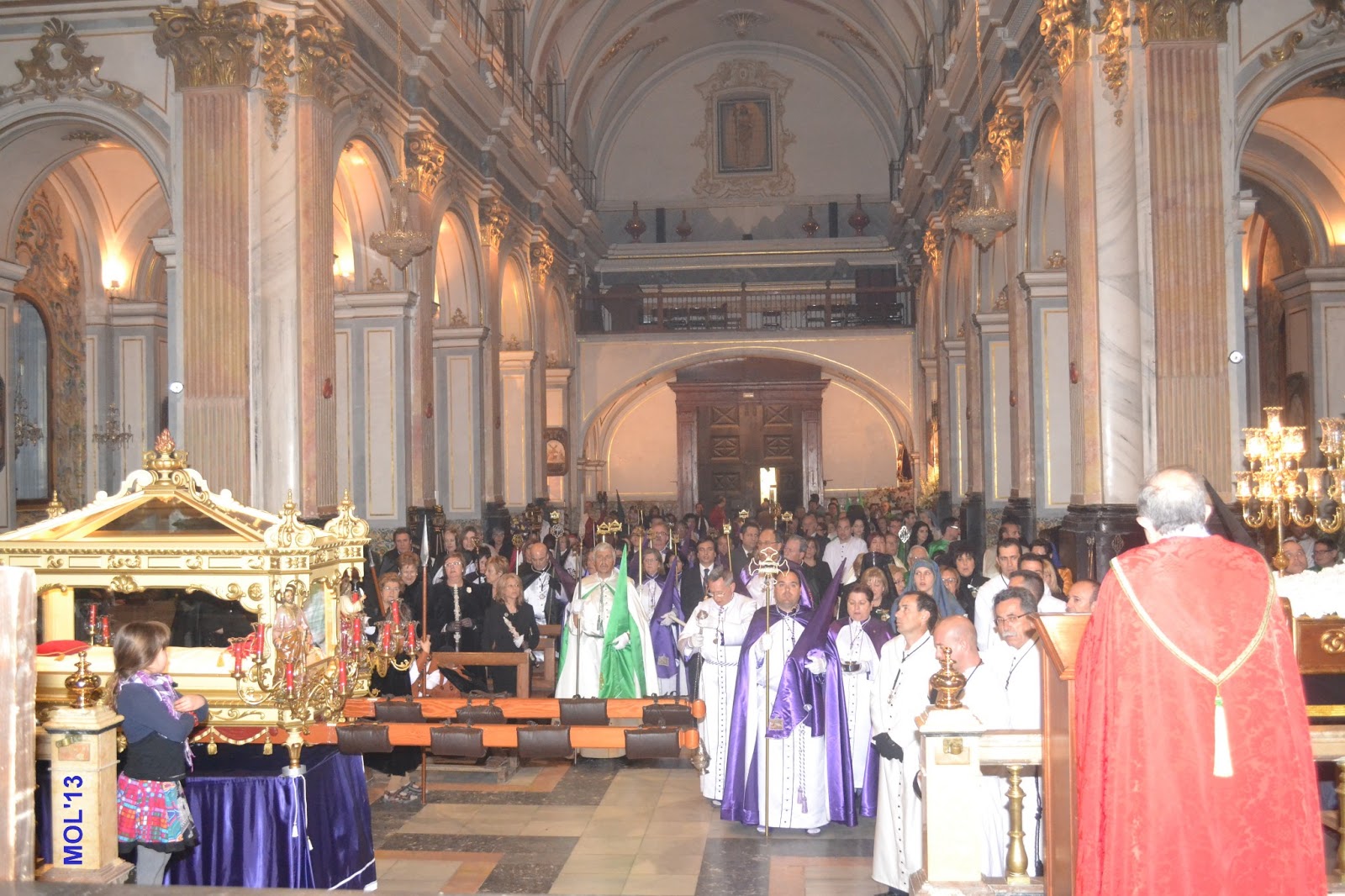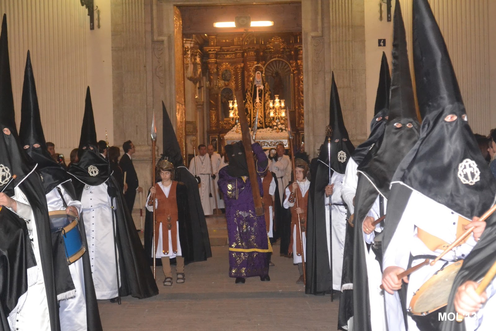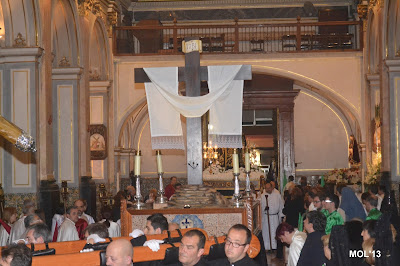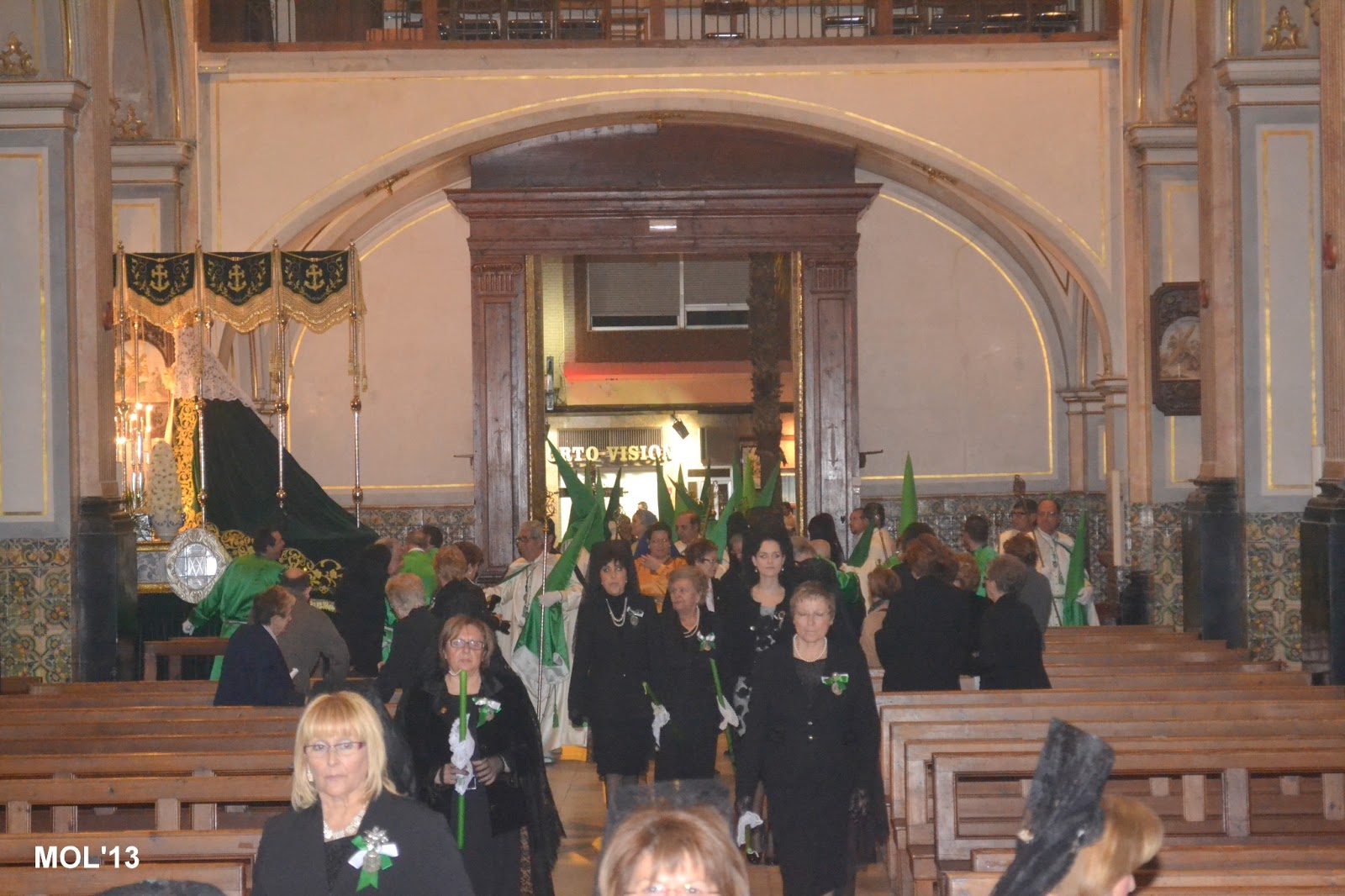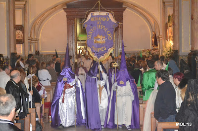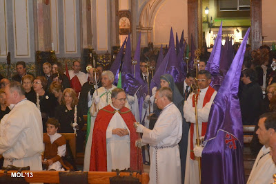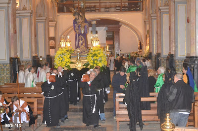 Entrada de los cofrades y las imágenes de cada Hermandad en la Parroquia de San Juan Bautista, donde cada imagen se guarda en el sitio establecido que tiene cada Hermandad.