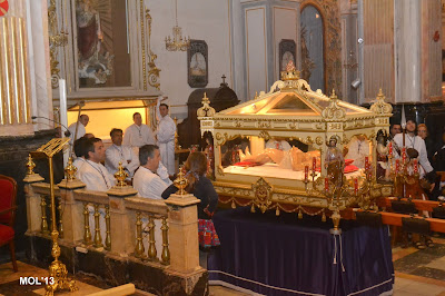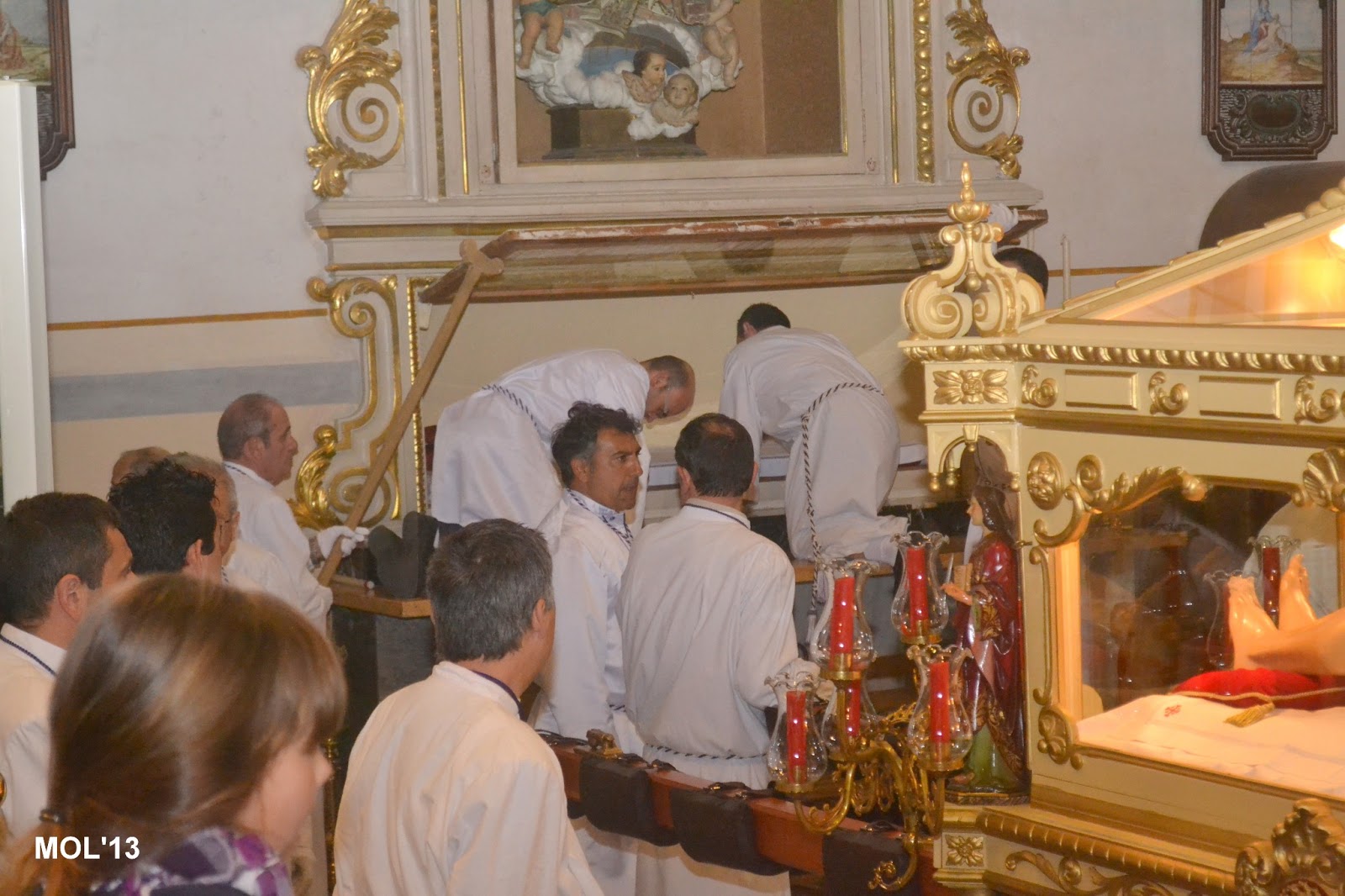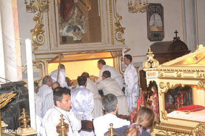 Una vez el Sepulcro en el interior de la Parroquia, se acondiciona el lugar donde Jesús reposará hasta el año próximo y don Valentín reza una oración antes de sacar la imagen de Cristo del Sepulcro y acomodarla en el lugar que corresponde.