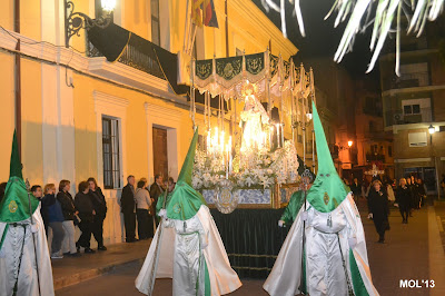 La Plaza de la Iglesia estaba llena de maniseros y de personas de fuera de nuestra Ciudad que querían ver pasar a los distintos pasos, algunos de ellos eran llevados en adornados carros, otros a hombros de los hermanos penitentes. Con gran silencio ha comenzado la procesión que ha seguido el orden siguiente: